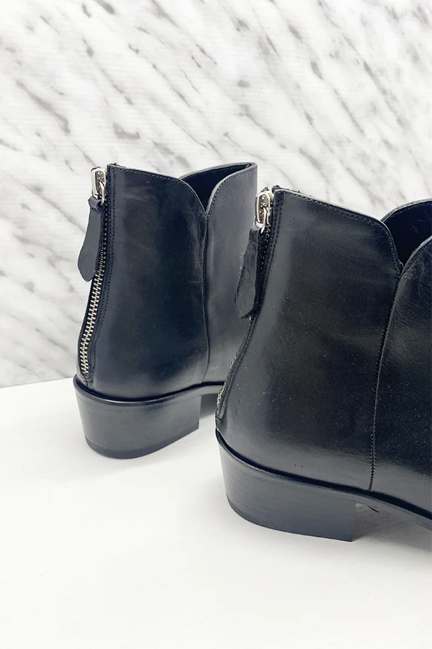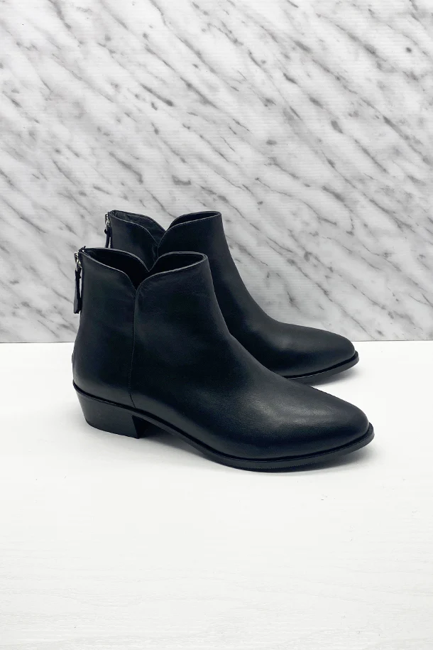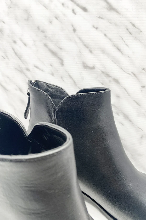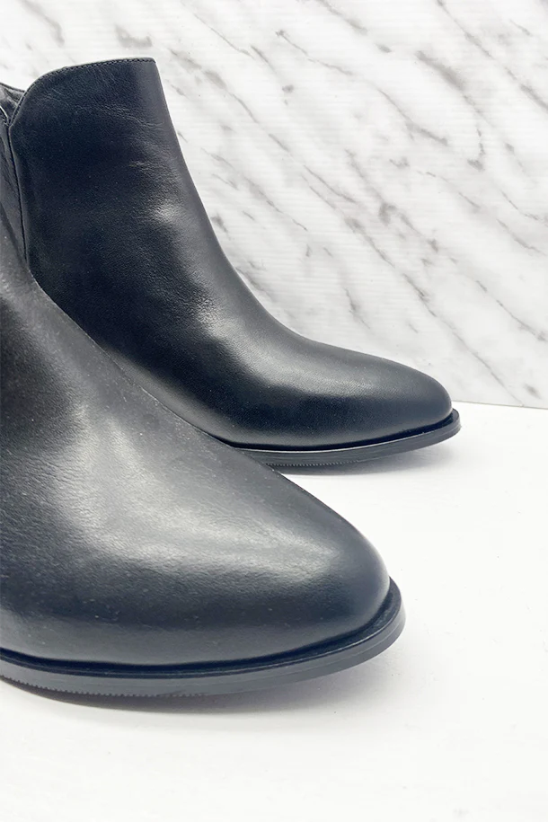 Stivaletti a punta sfilata in pelle solid color, gambale con taglio invacato, zip posteriore, tacco 30mm in legno con fondo e suola in gomma