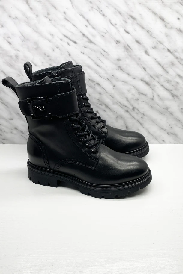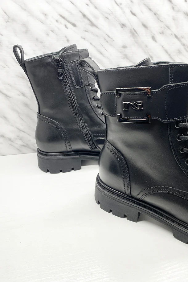 Stivaletti in pelle con fascia in tinta e maxi logo metallico, zip laterale interna, suola in gomma a carrarmato