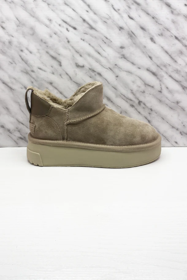 Stivaletti morbidi in pelle scamosciata solid color con interno in pelo a contrasto, gambale asimmetrico, cuciture a taglio vivo, suola platform 40mm in gomma