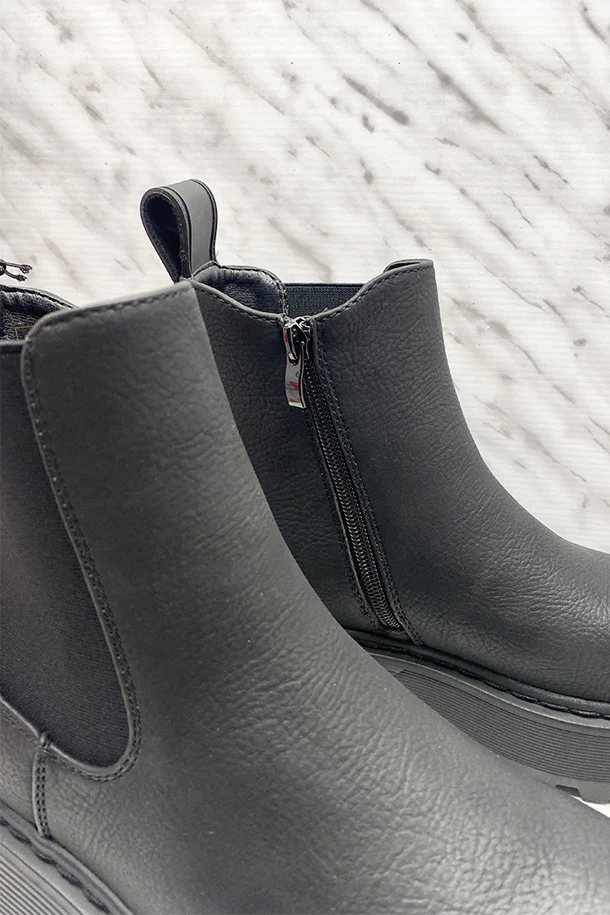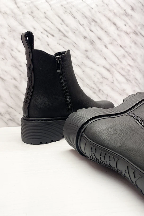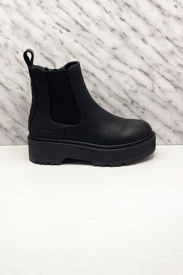Stivaletti in eco pelle solid color con zip laterale interna, inserto elastico esterno, laccio posteriore con fascia gommata logata, suola rialzata in gomma a carrarmato