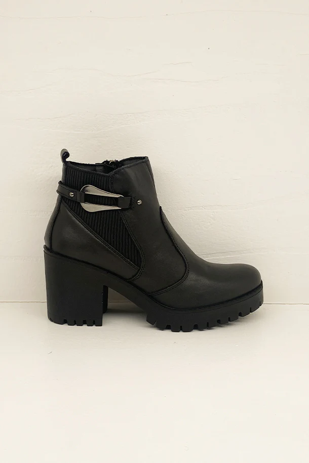 Stivaletti in pelle solid color con inserto elasticizzato in tinta, zip laterale interna, fibbia metallica decorativa, interno foderato, tacco 70mm e fondo in gomma