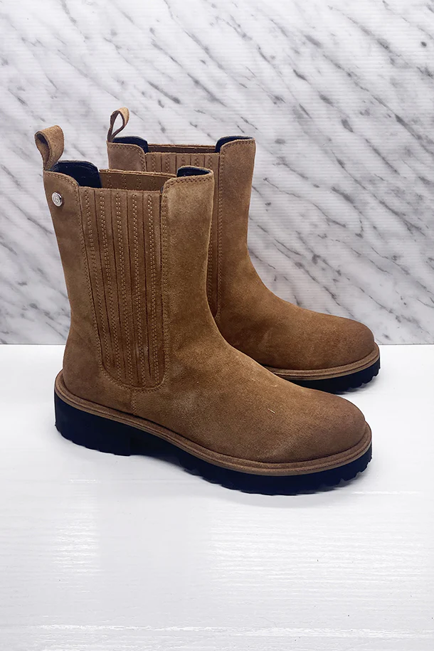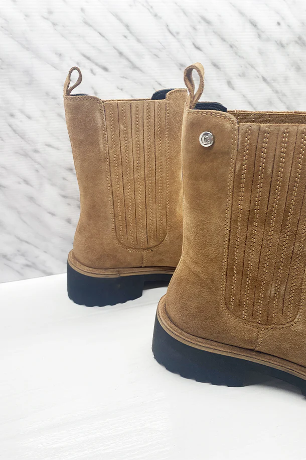 Stivaletti slip on in eco pelle con fasce elastiche laterali nascoste da frange in tinta, logo metallico, suola in gomma in tinta a contrasto