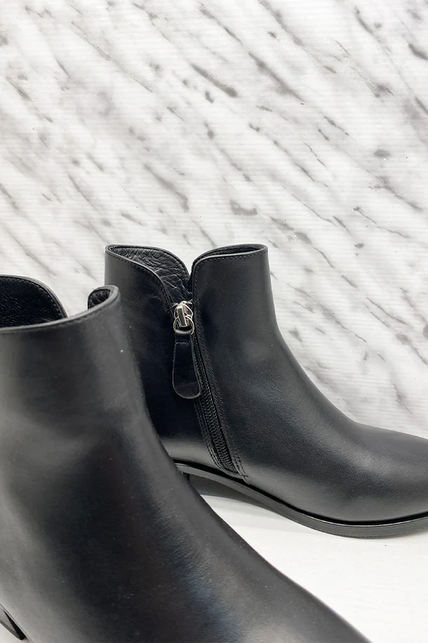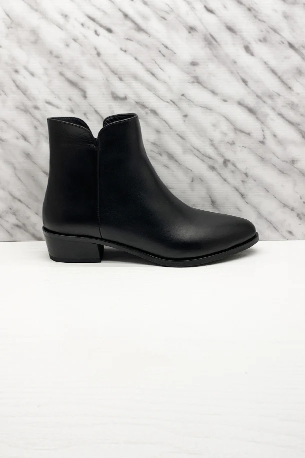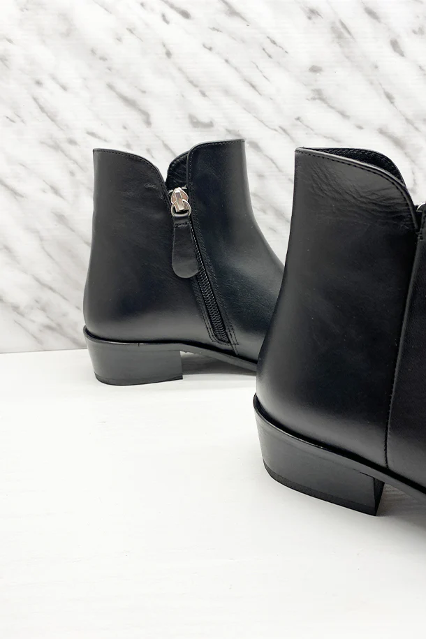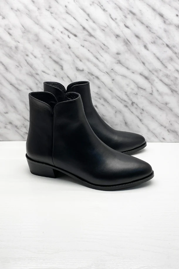 Stivaletti con gambale sagomato in pelle solid color, zip laterale interna, suola interna in pelle, tacco texano 40mm in legno con fondo e suola in gomma