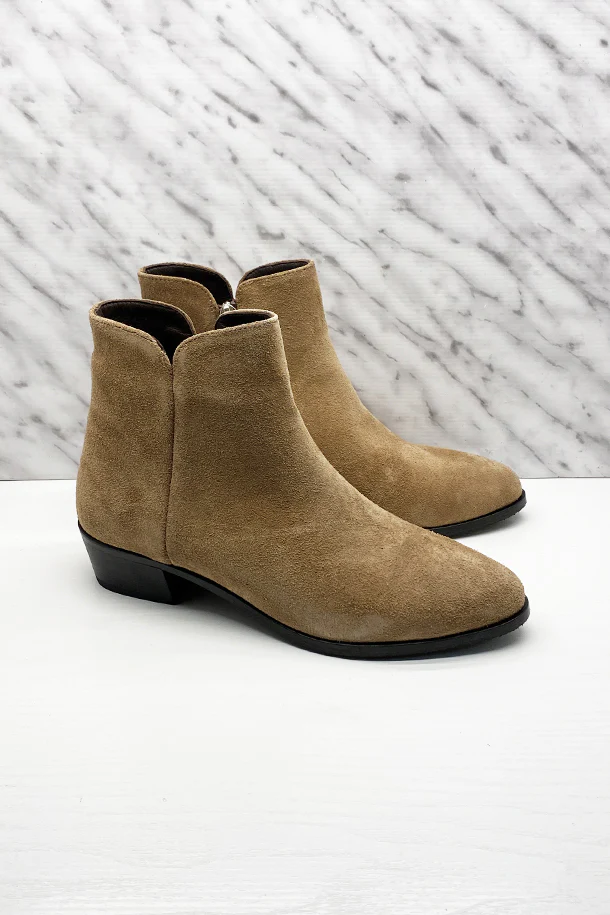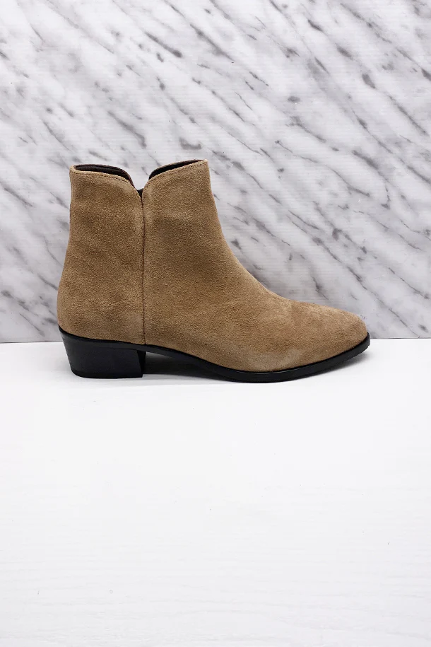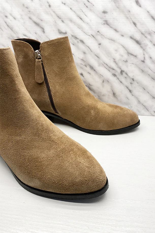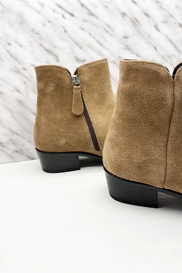 Stivaletti con gambale sagomato in pelle scamosciata solid color, zip laterale interna, suola interna in pelle, tacco texano 40mm in legno con fondo e suola in gomma