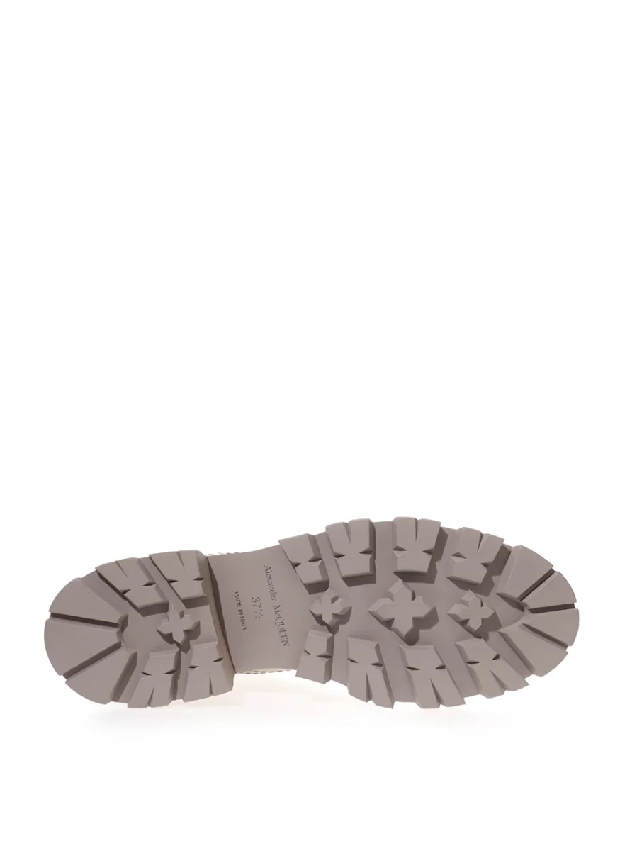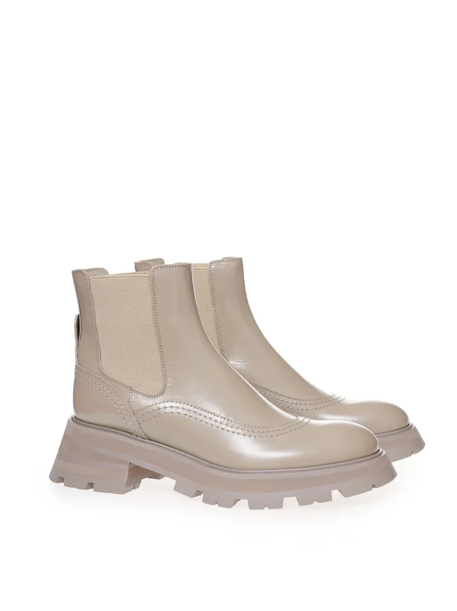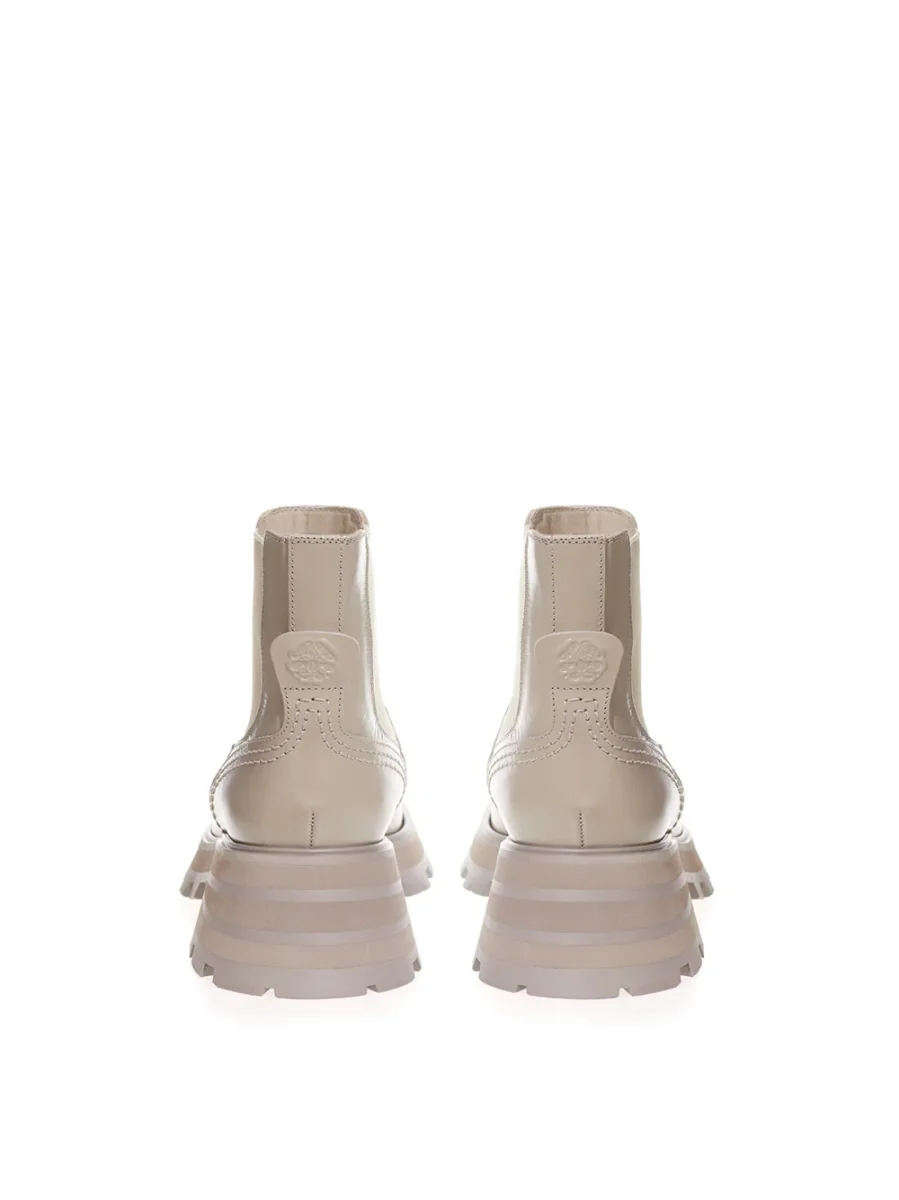 Stivaletti Chelsea Alexander McQueen in pelle spazzolata, color tortora, impunture tono su tono, suola dentellata oversize svasata, tacco stratificato. Logo stampato sulla linguetta posteriore, fasce elasticizzate ai lati. Composizione: 100% Pelle-Sku interno:23AP66-75
