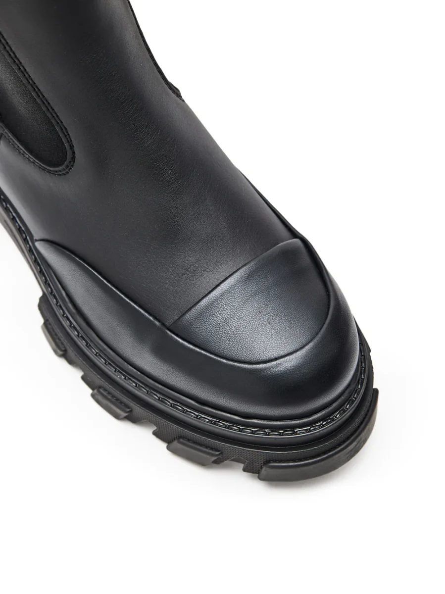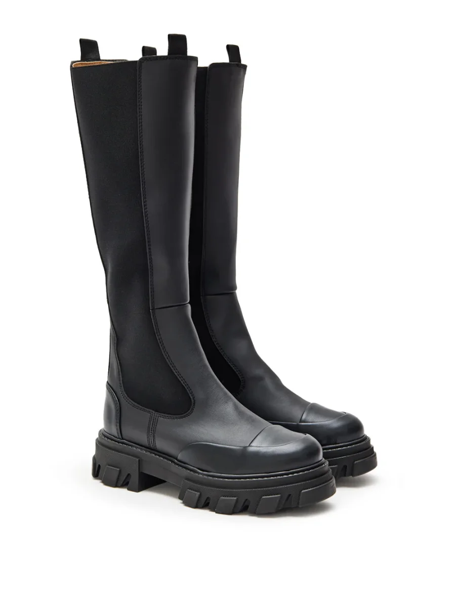 Stivali Alti Chelsea Knee-High in Nero. In pelle nera con due bande elastiche ai lati, punta tonda, punta rinforzata con dettaglio in pelle applicato. Suola esterna chunky.