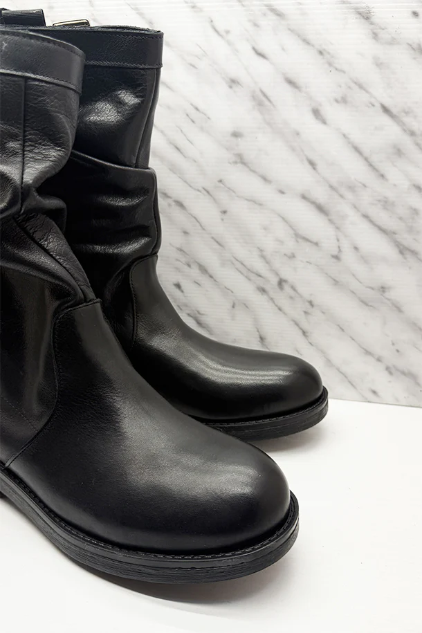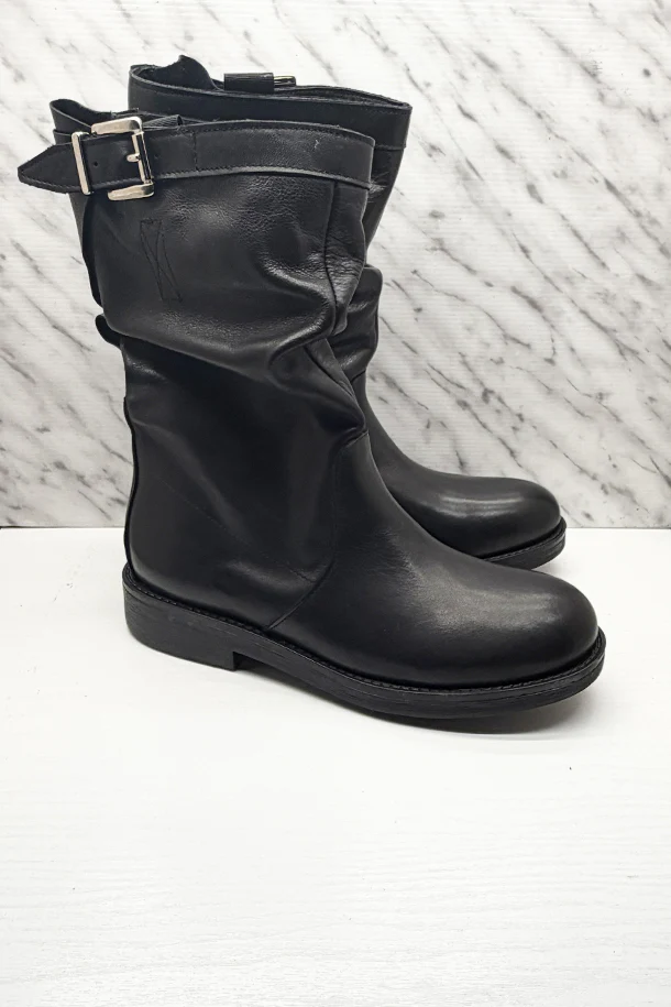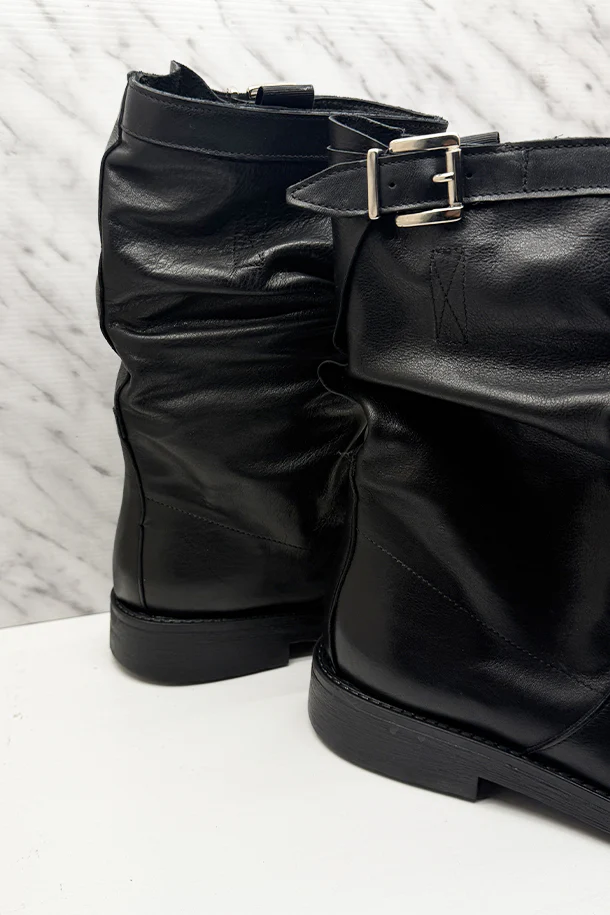 Stivali bassi sfilati in pelle solid color con gambale destrutturato, fascia con fibbia metallica, lacci elastici interni, fondo classic in gomma