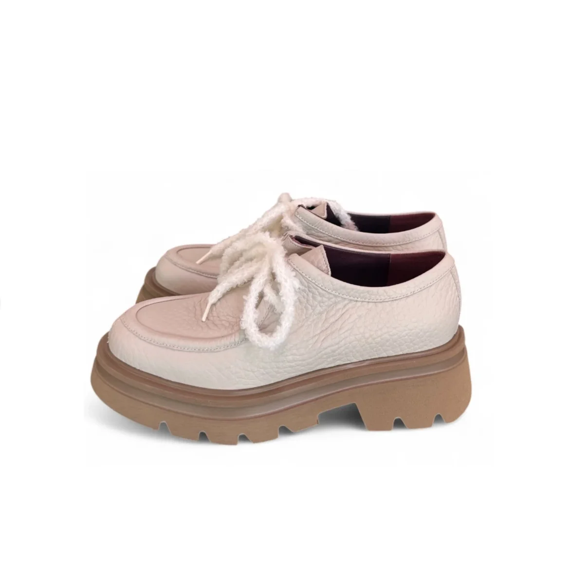 La nuova CARLOTTA 12 reinterpreta la classica scarpa stringata stile ingegnere in chiave moderna ed elegante. Realizzata in pelle bottalata color latte, conquista per la sua texture morbida e raffinata, capace di donare carattere a ogni look.