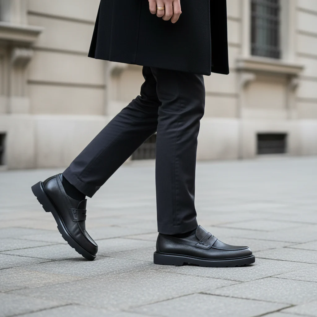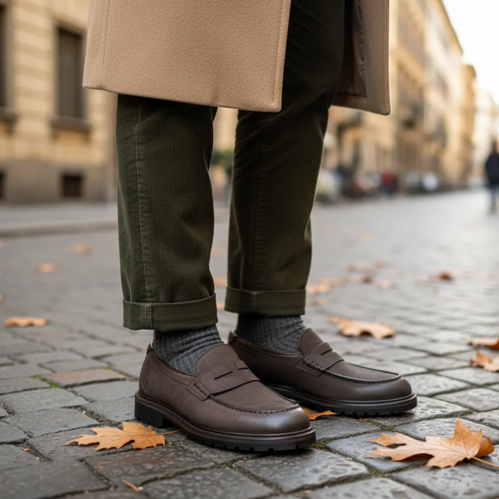 Outerwear urbano (bonus): trench tecnico o field jacket; la suola carrarmato aggiunge grip e carattere nelle giornate di pioggia.