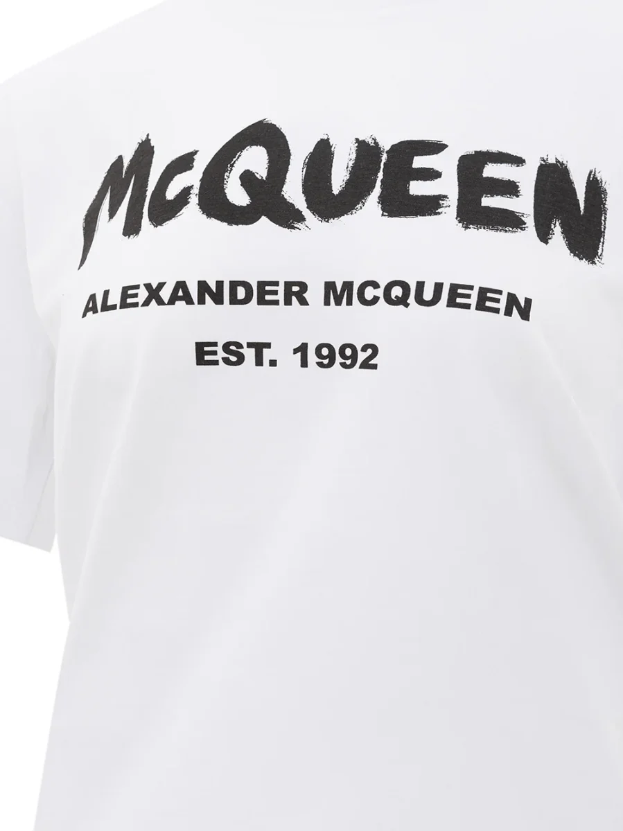 T-Shirt Bianca McQueen, girocollo, maniche corte, stampa logo a contrasto sul fronte, vestibilità regular. Taglia Europea 40, corrispondente a 44IT. Composizione: 100% Cotone-Sku interno:23FE95-97