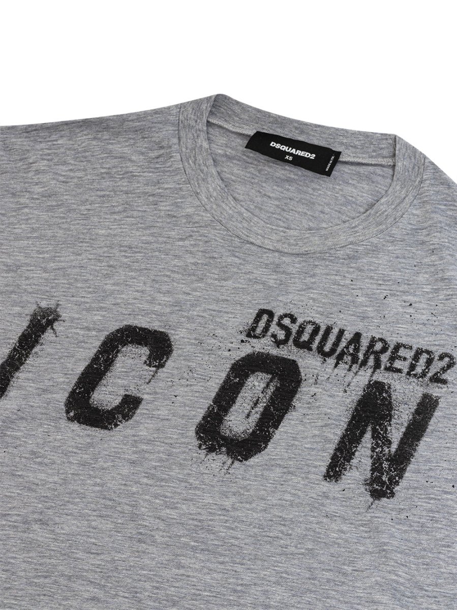 T-Shirt Grigio Mélange Dsquared2. In cotone grigio, girocollo, maniche corte, regular fit. Stampa nera con logo a contrasto sul fronte con effetto spray. Composizione: 100% Cotone-Sku interno:24MG23