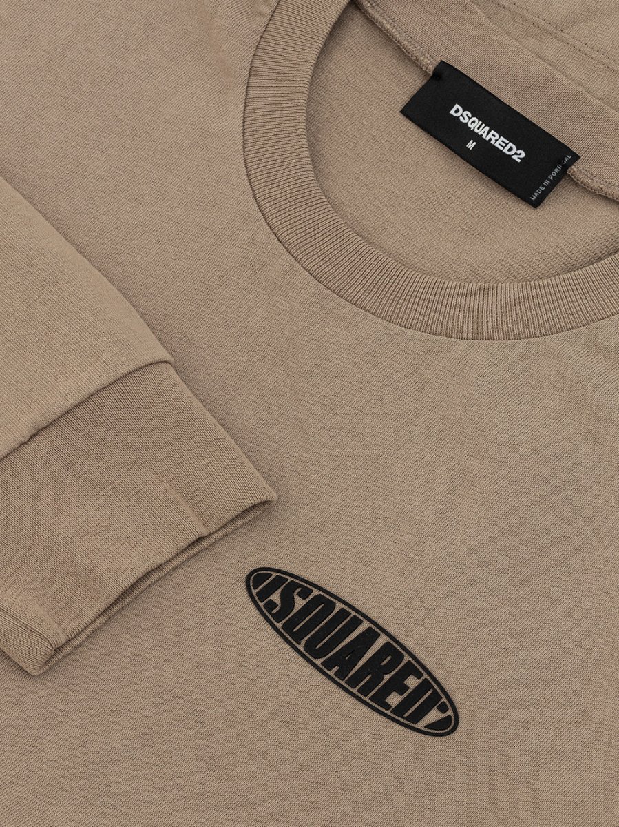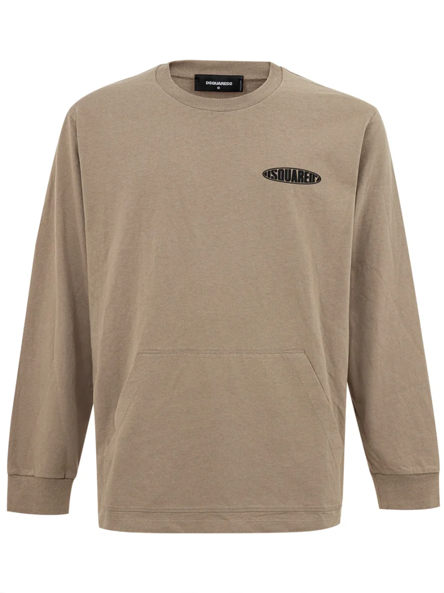 T-Shirt Maniche Lunghe con logo Dsquared2. In cotone beige, girocollo, maniche lunghe logo in gomma nera a contrasto sul lato, maxi tasca frontale, spacchetti sui lari, vestibilità over. Composizione: 100% Cotone-Sku interno:24MG03