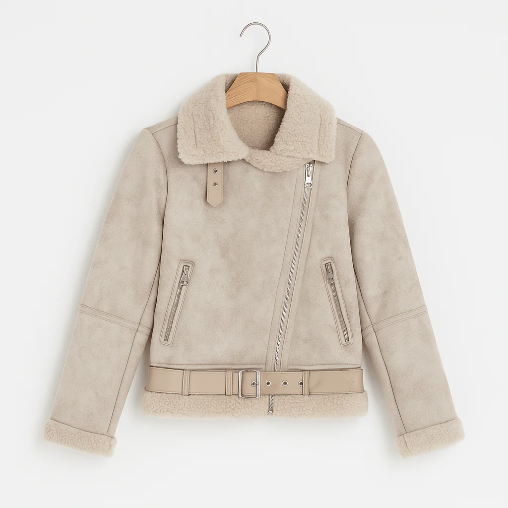 Giacca in ecopelle scamosciata effetto shearling, proposta in un elegante tono beige. Il modello presenta un colletto ampio con interno in pelliccia sintetica, che continua anche sui polsini e sul fondo, donando un look caldo e raffinato. La chiusura è asimmetrica con zip metallica, affiancata da due tasche laterali con zip. Completa il design la cintura in vita, regolabile, che definisce la silhouette.