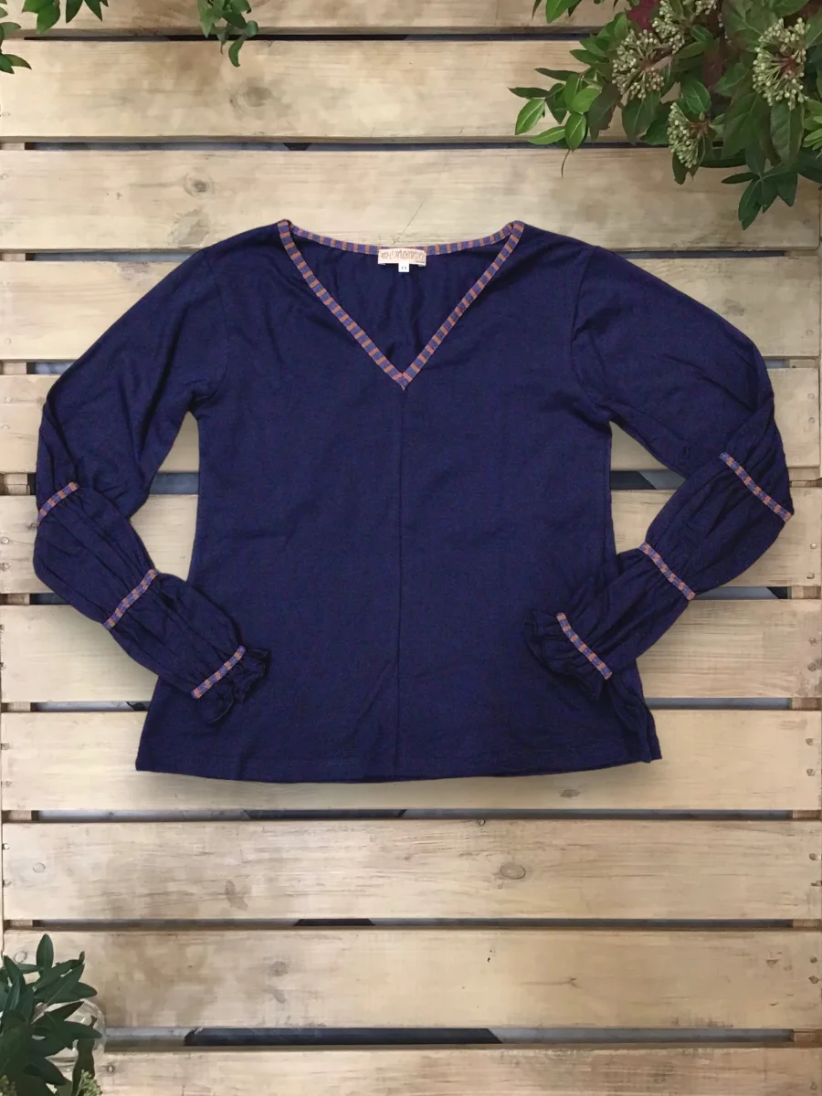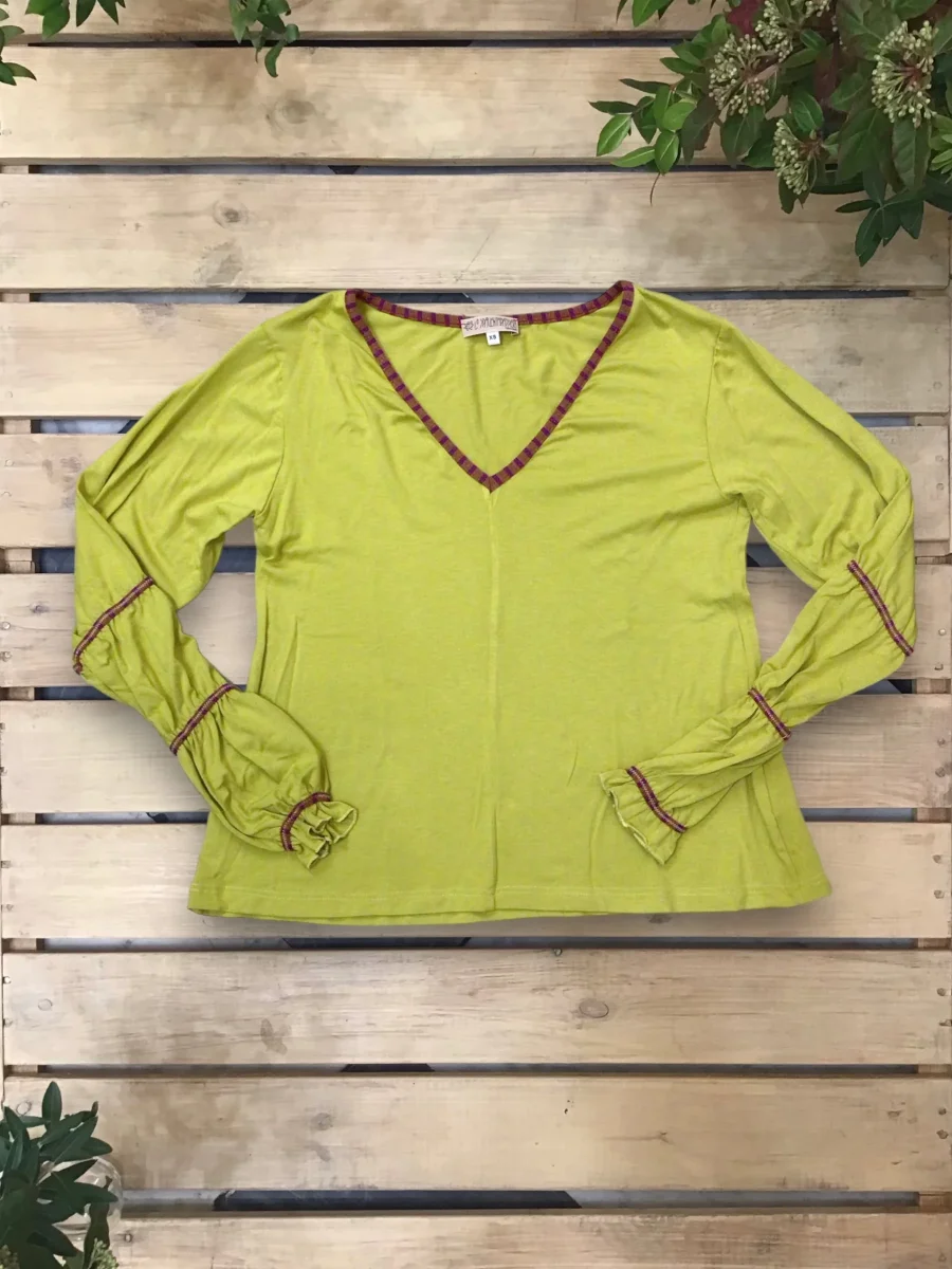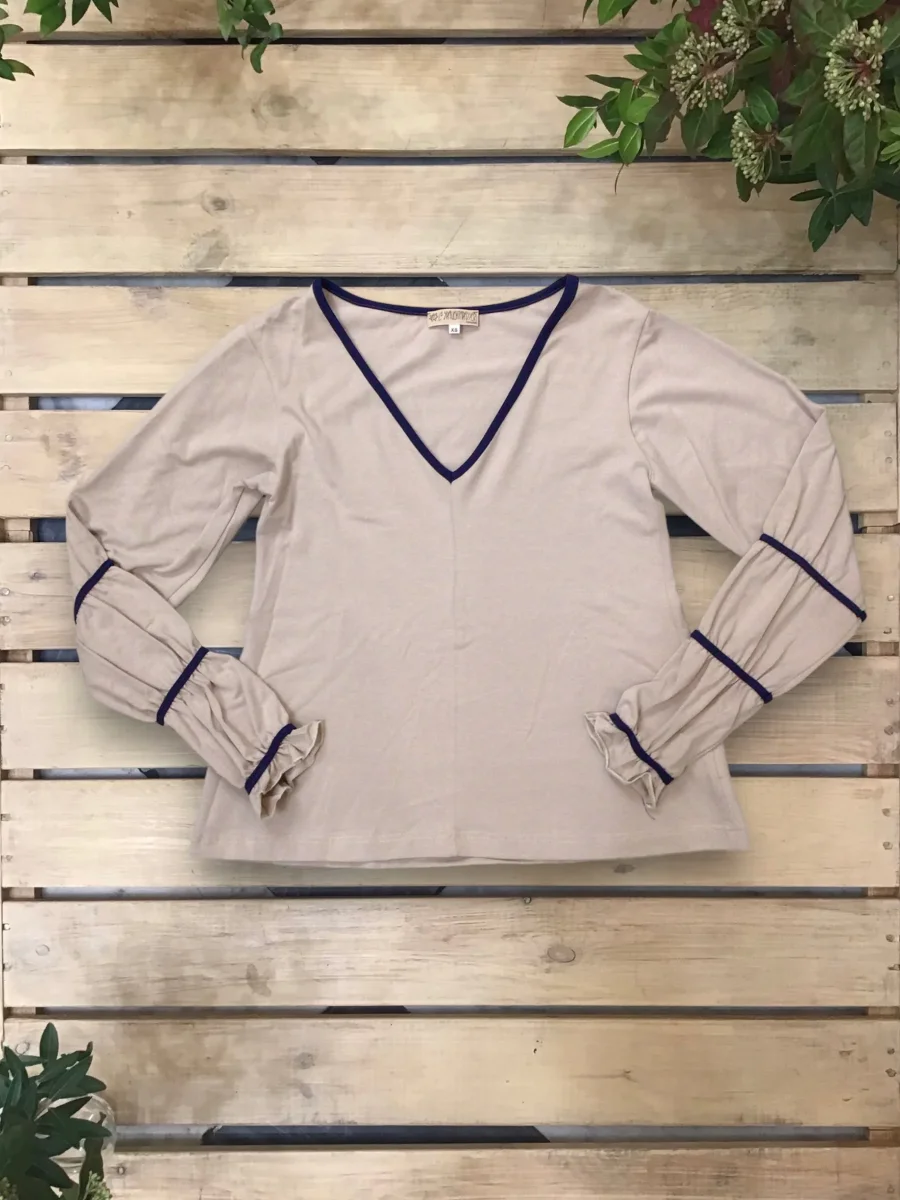 Maglia svasata con scollo a “V”, con maniche arricciate da un inserto in maglina a contrasto. Bordo collo a contrasto.