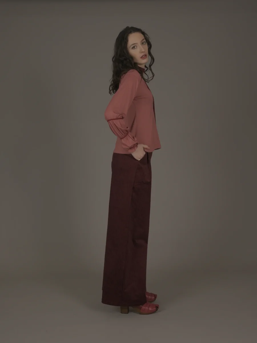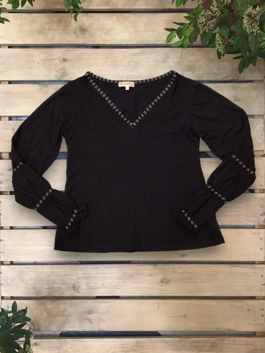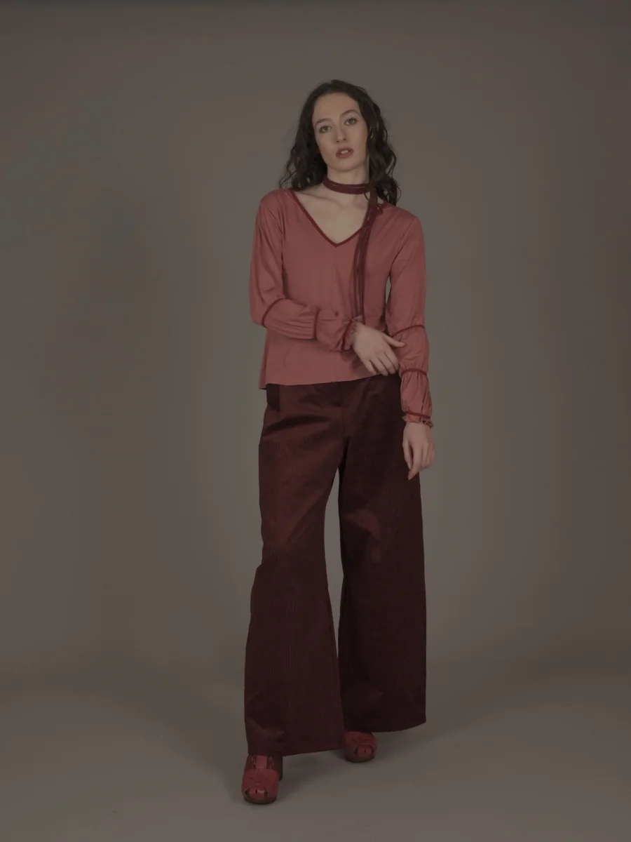 Maglia svasata con scollo a “V”, con maniche arricciate da un inserto in maglina a contrasto. Bordo collo a contrasto.