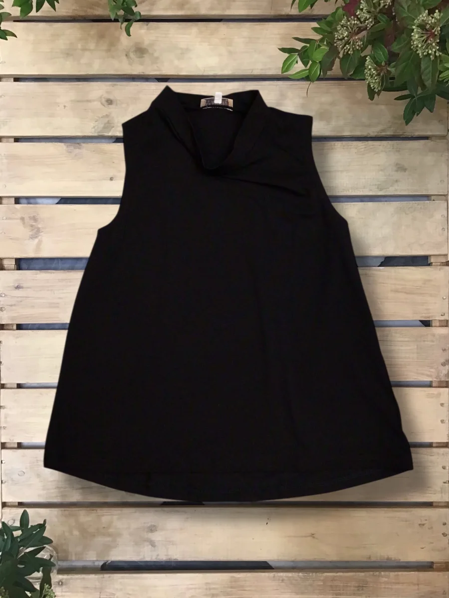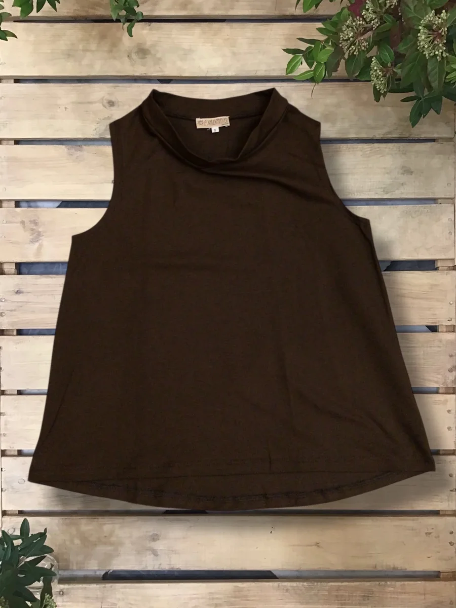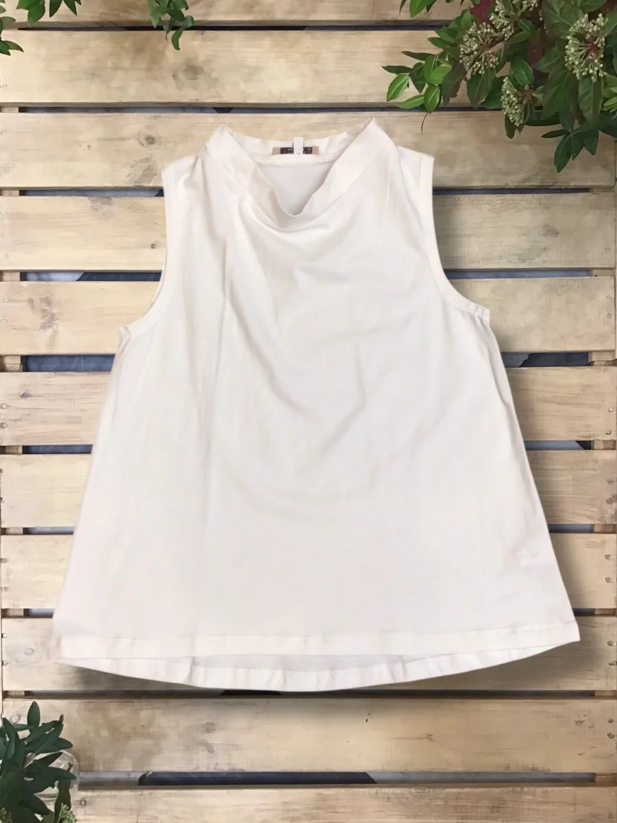 Top in jersey svasato e smanicato, leggermente più corto davanti e più lungo dietro. Girocollo, con colletto alla coreana.