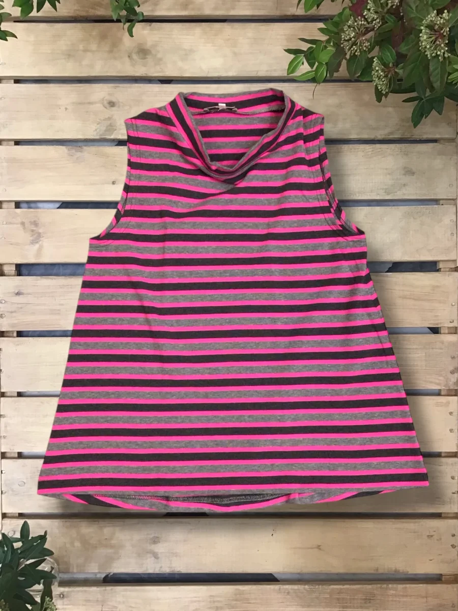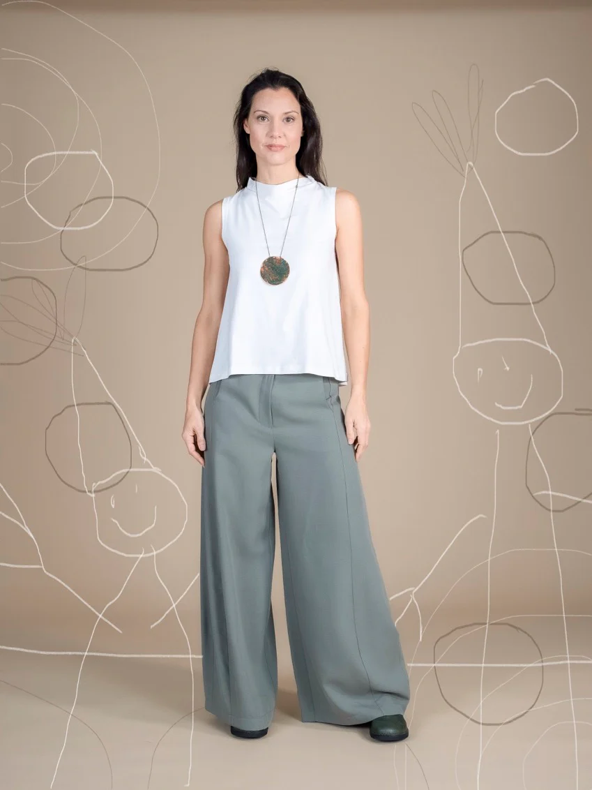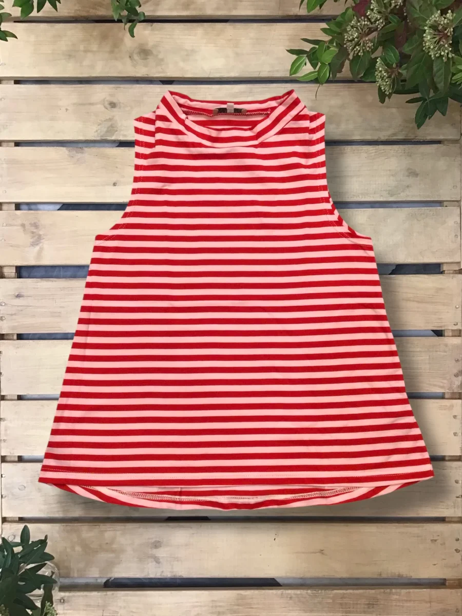 Top in jersey svasato e smanicato, leggermente più corto davanti e più lungo dietro. Girocollo, con colletto alla coreana.