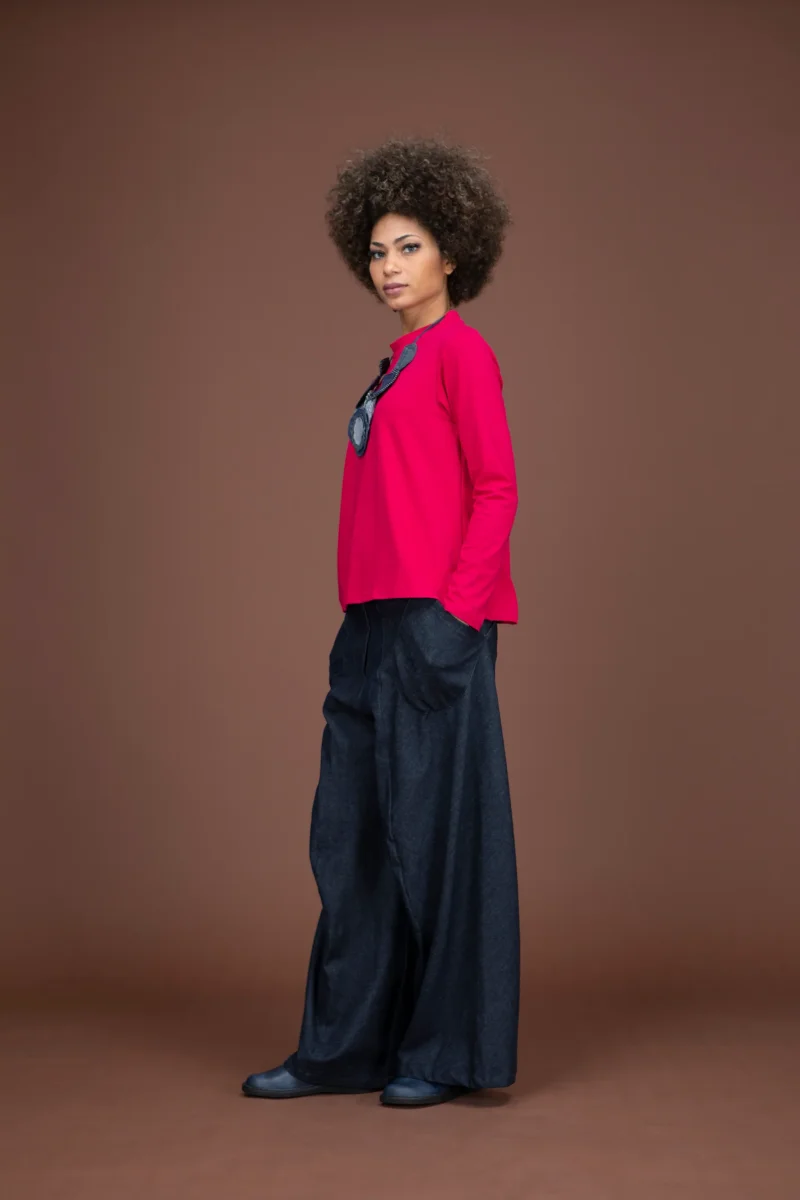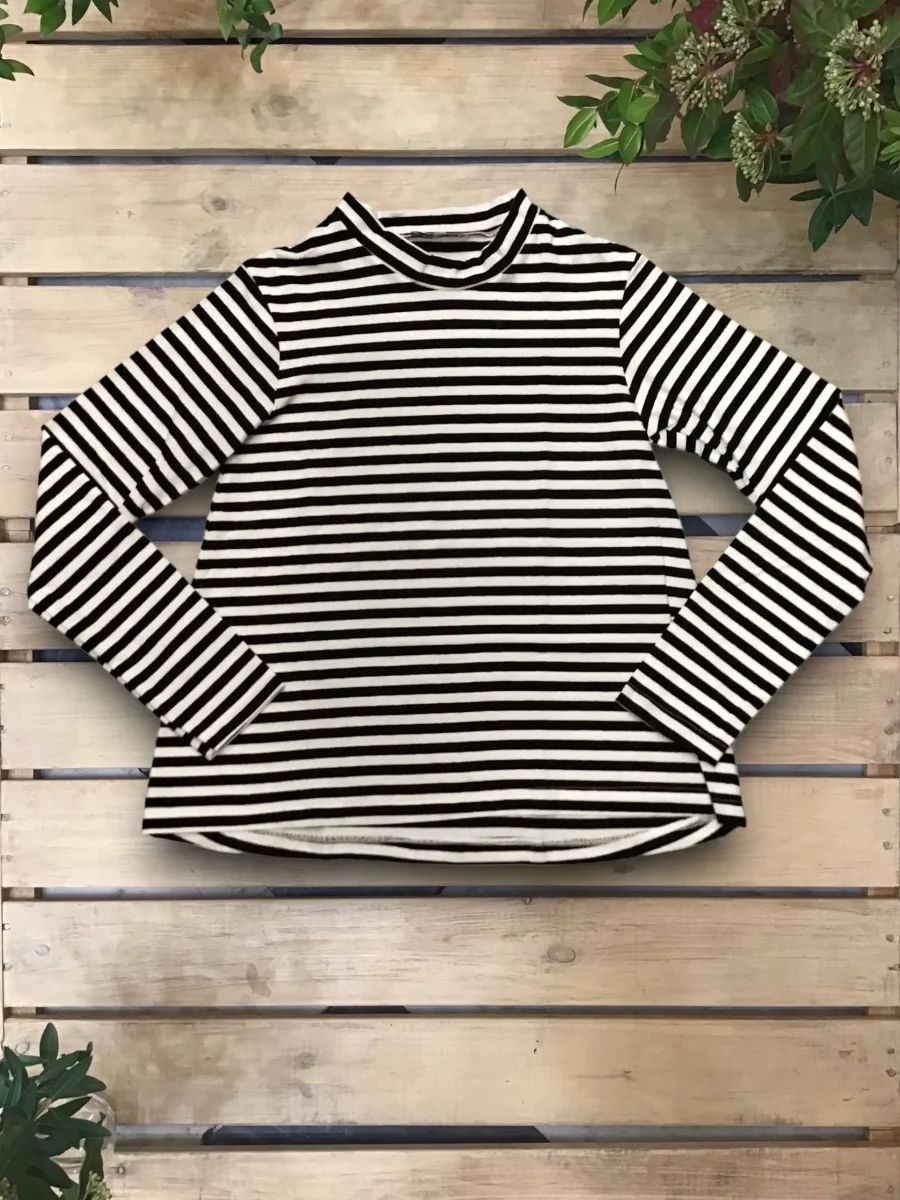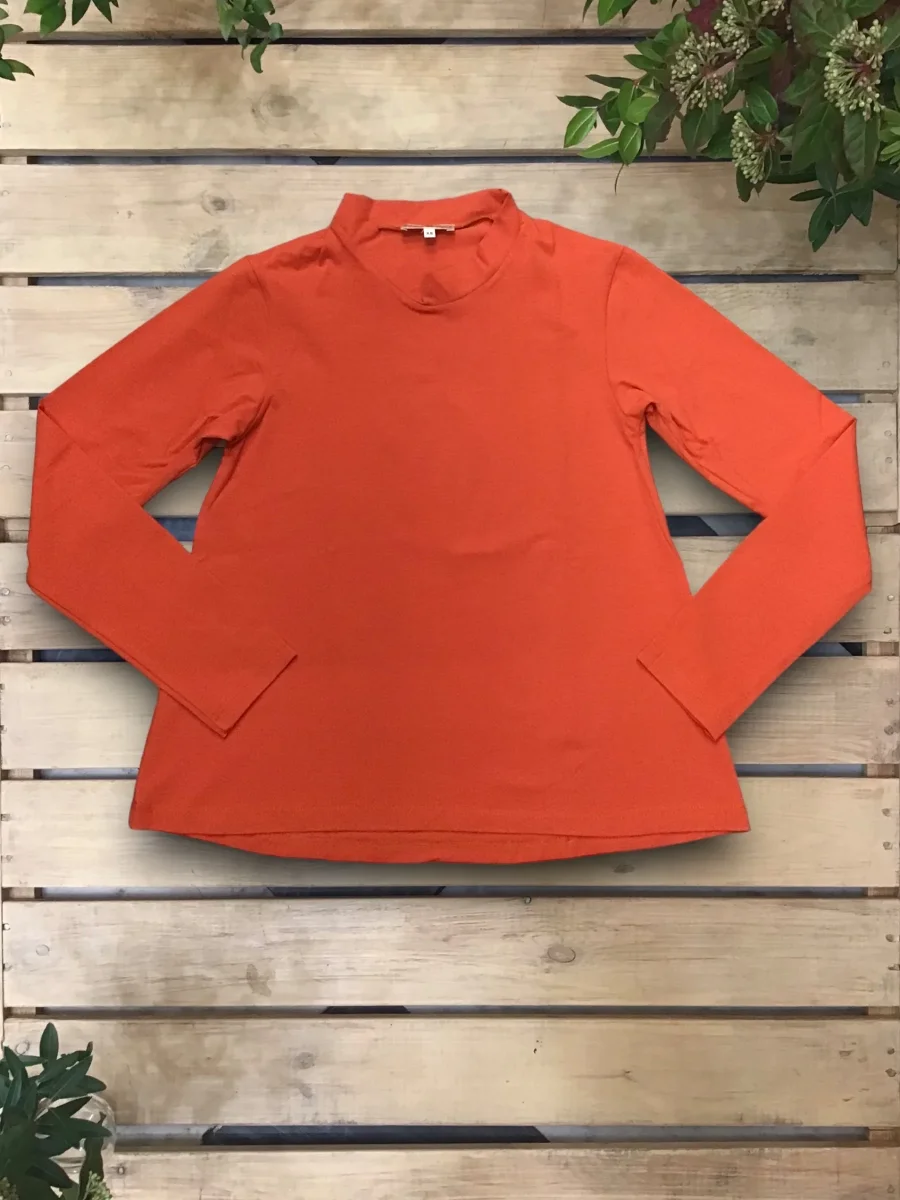 Top in jersey svasato, leggermente più corto davanti e più lungo dietro. Girocollo, con colletto alla coreana.