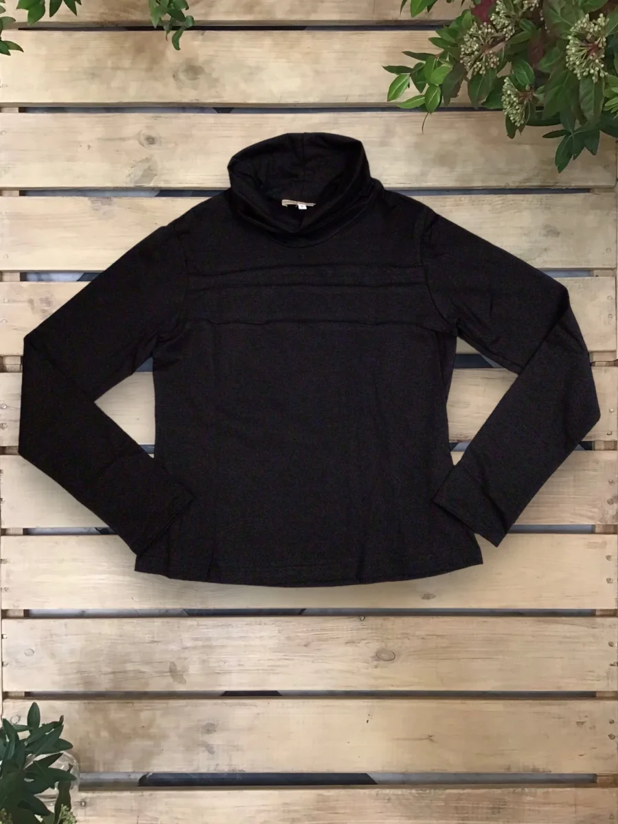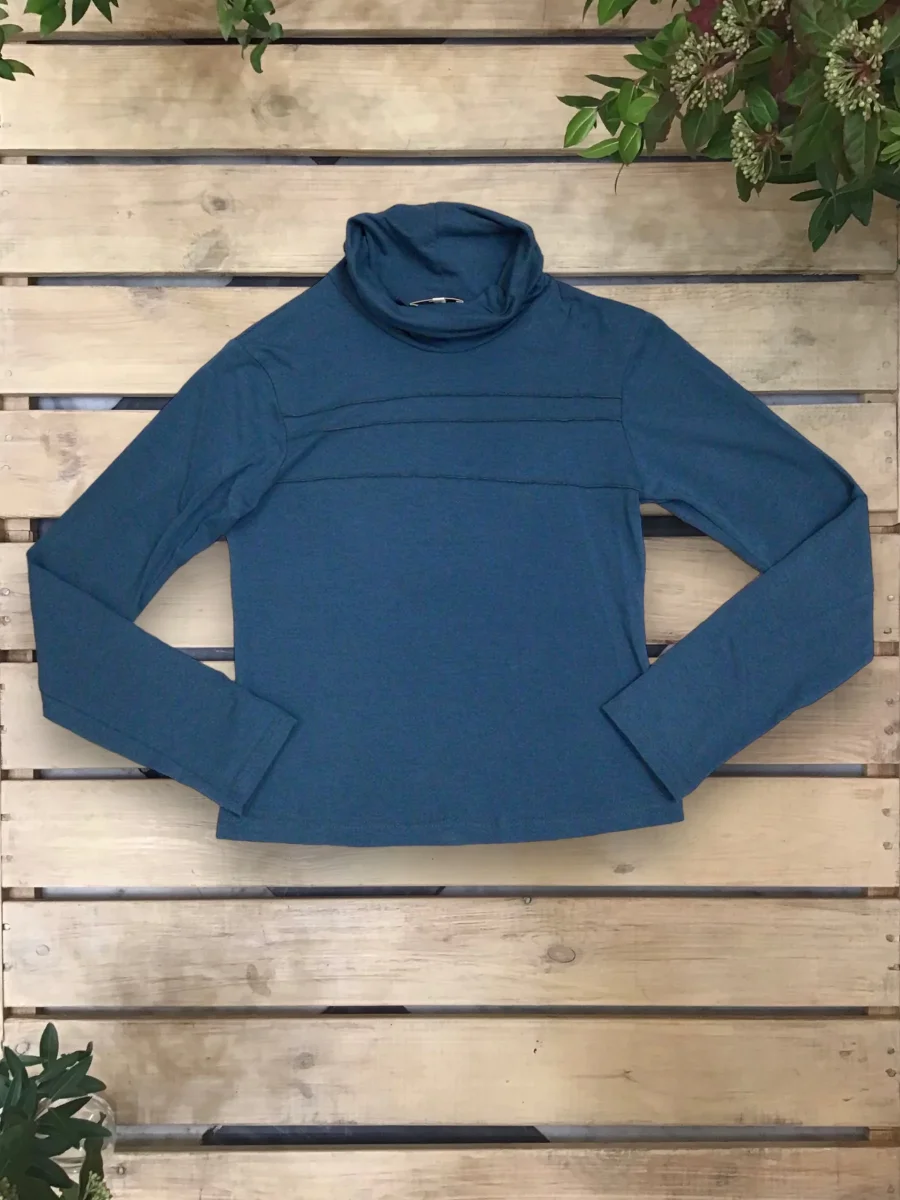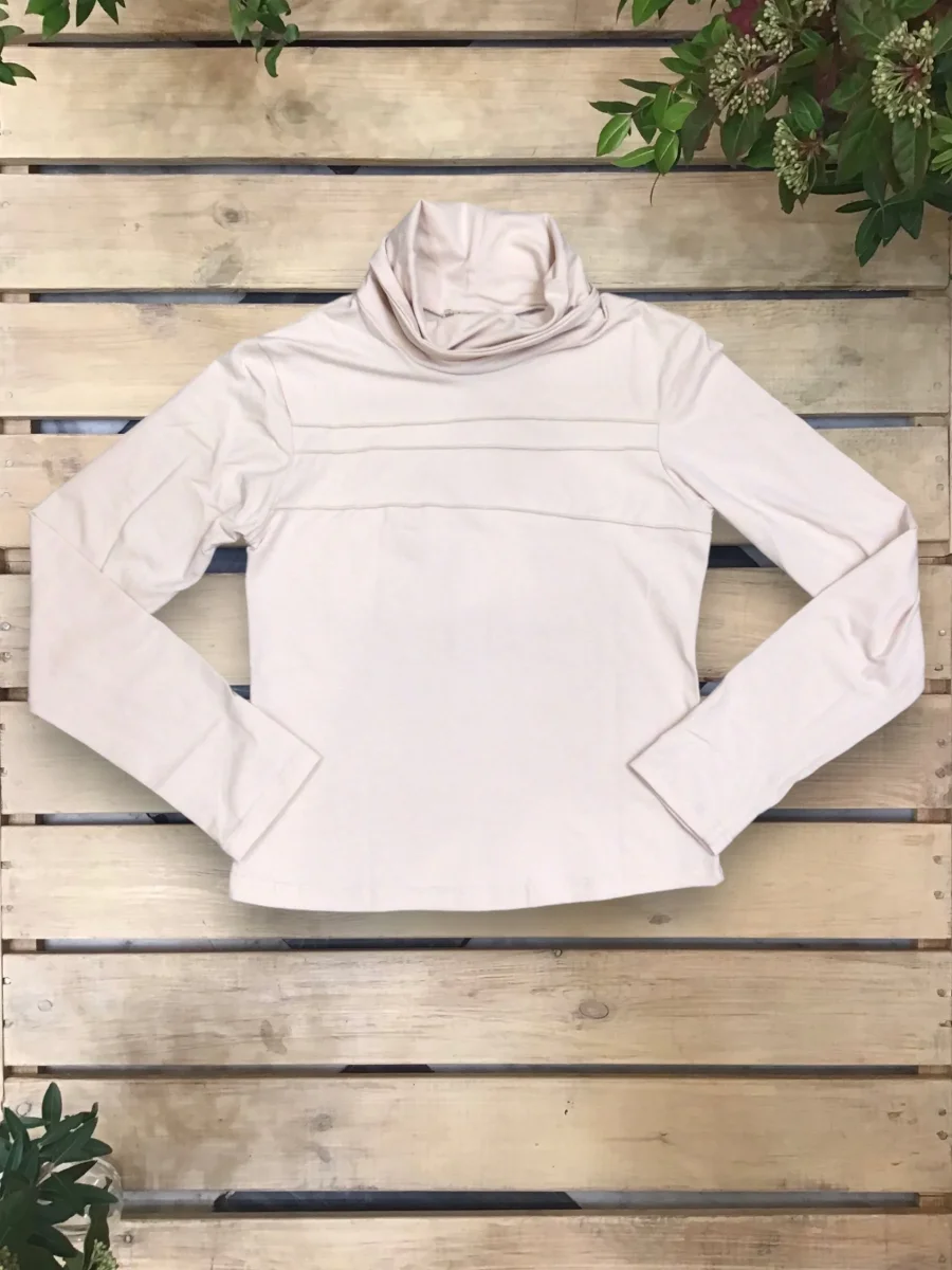 Maglia sagomata con collo alto e nervature davanti.
