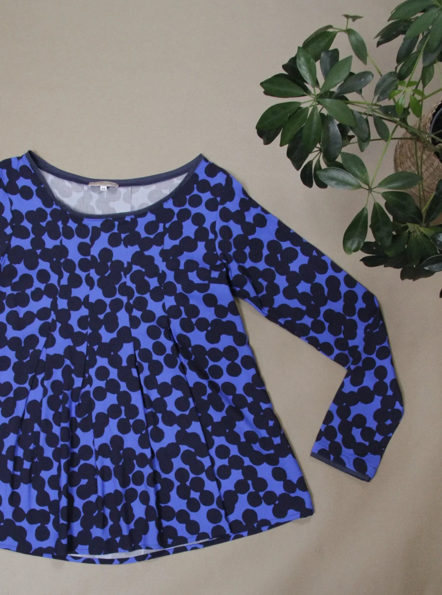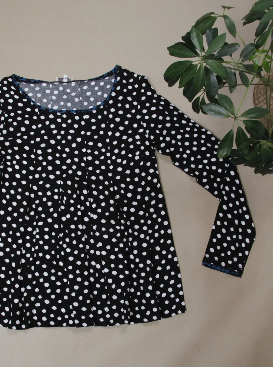 Camicietta in viscosa con pieghe sul davanti. I bordini del collo e delle maniche sono i tessuto a contrasto.