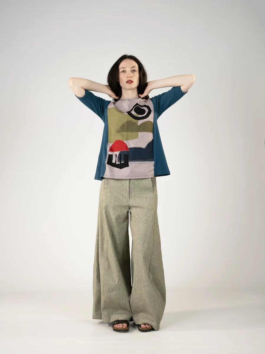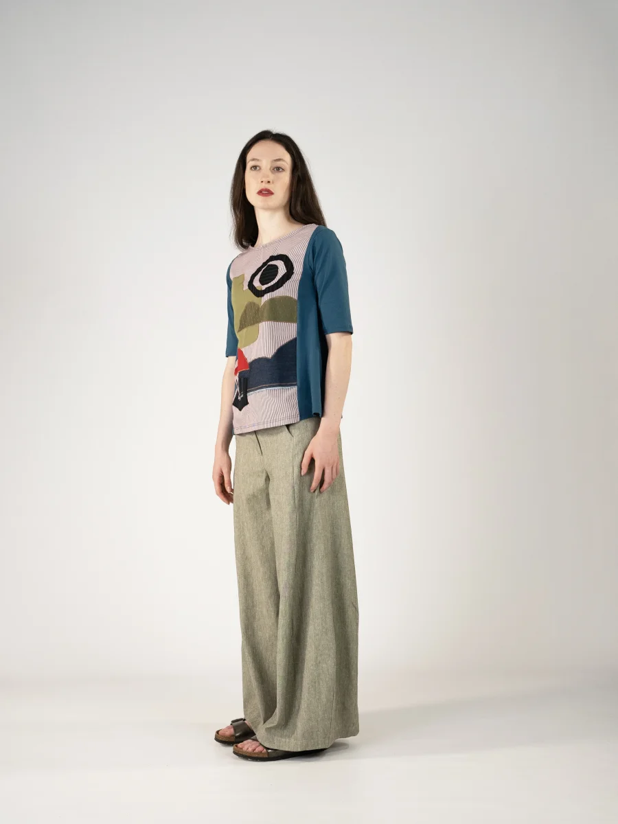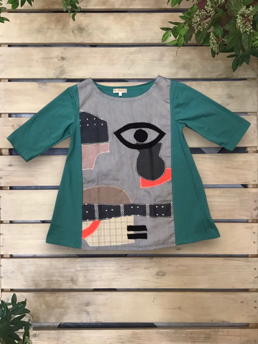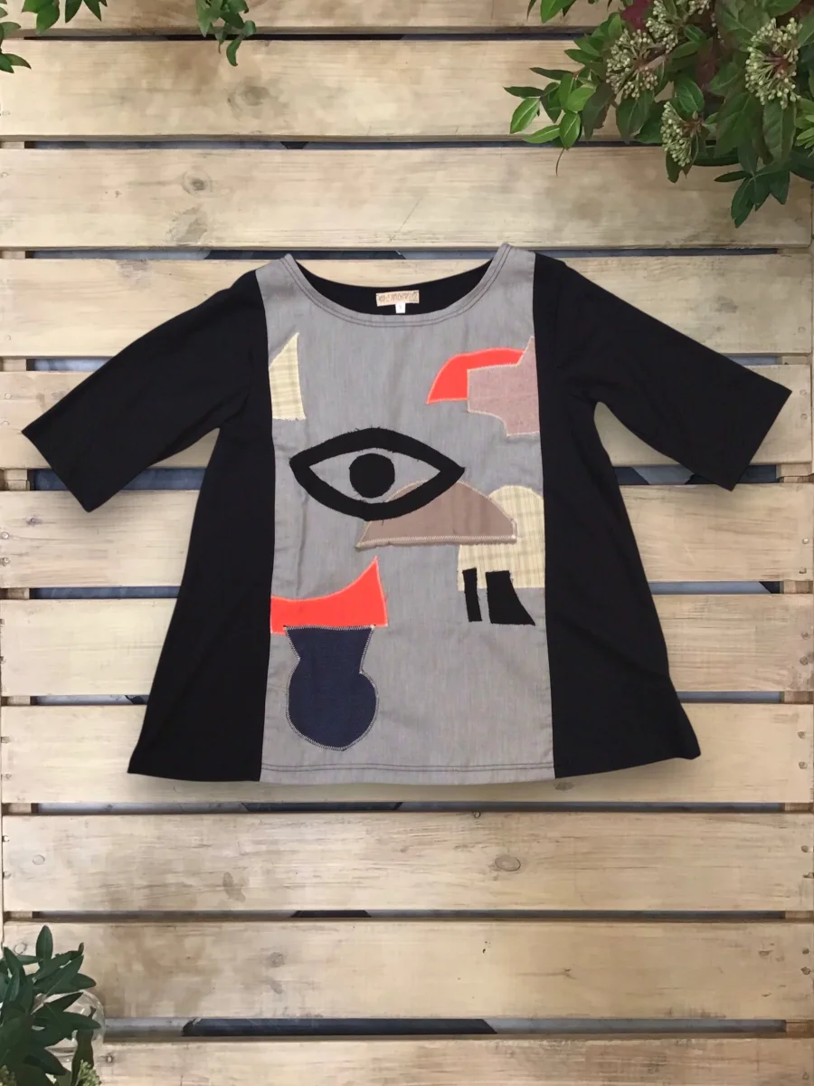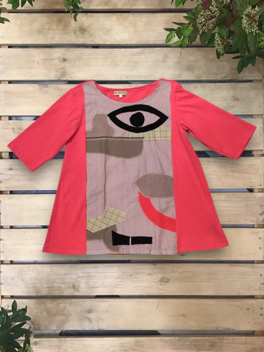 Top in jersey, svasato, la parte frontale è decorata a mano con pezzi di tessuto applicati a zig zag. Ogni pezzo è diverso dagli altri.