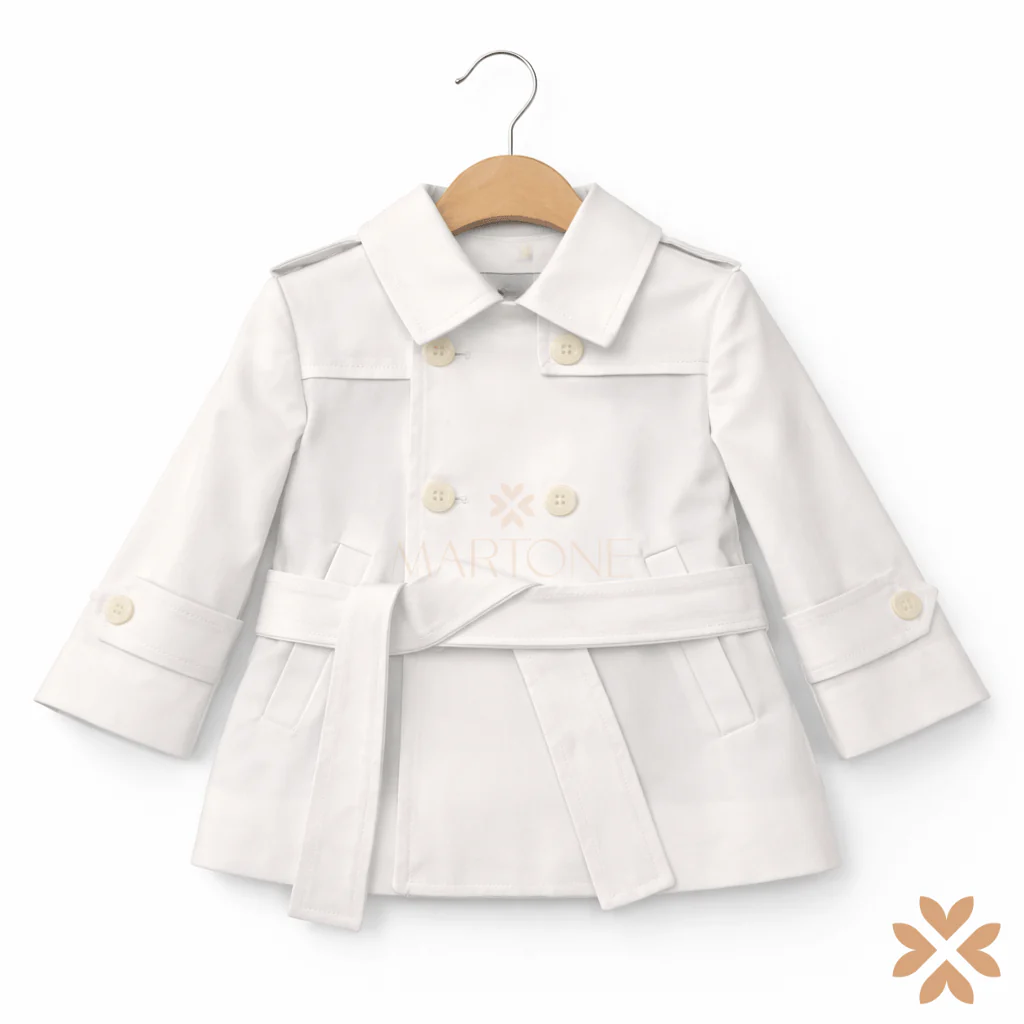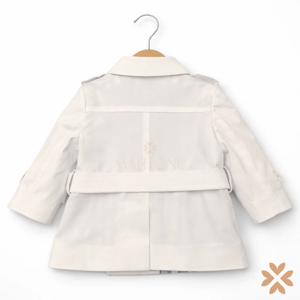 Trench bimbo dal design sartoriale e senza tempo. Modello doppiopetto con bottoni, cintura coordinata in vita e tasche laterali. Colletto classico e maniche rifinite con cinturino. All’interno, fodera a righe celesti e bianche che aggiunge un dettaglio ricercato e distintivo. Un capo iconico, perfetto per completare outfit da cerimonia con eleganza e carattere.