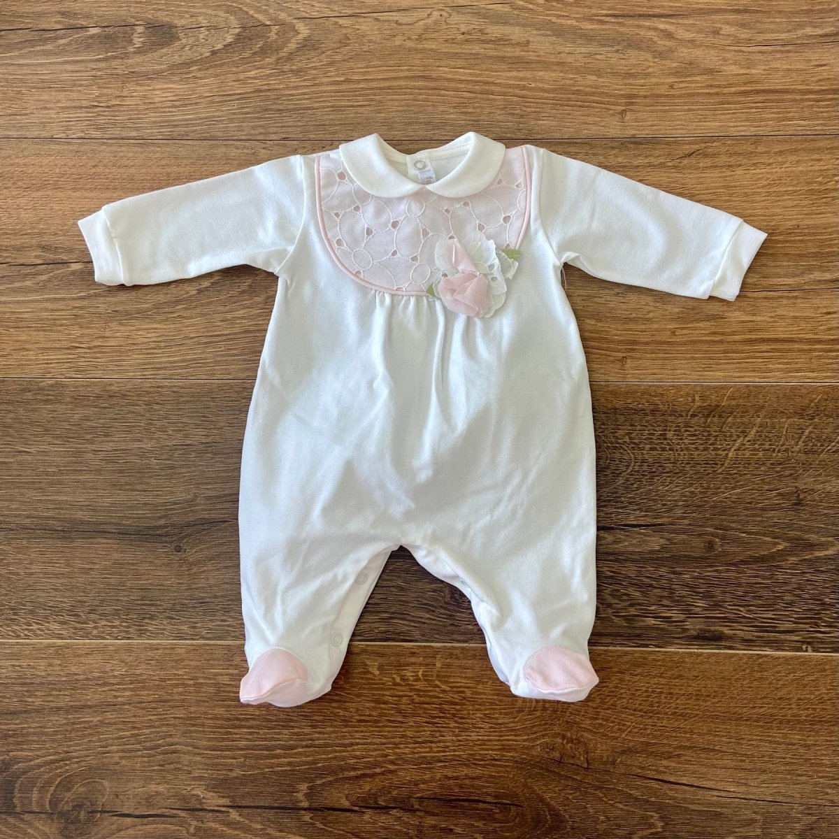 Tutina con pizzo san gallo e richiami rosa.