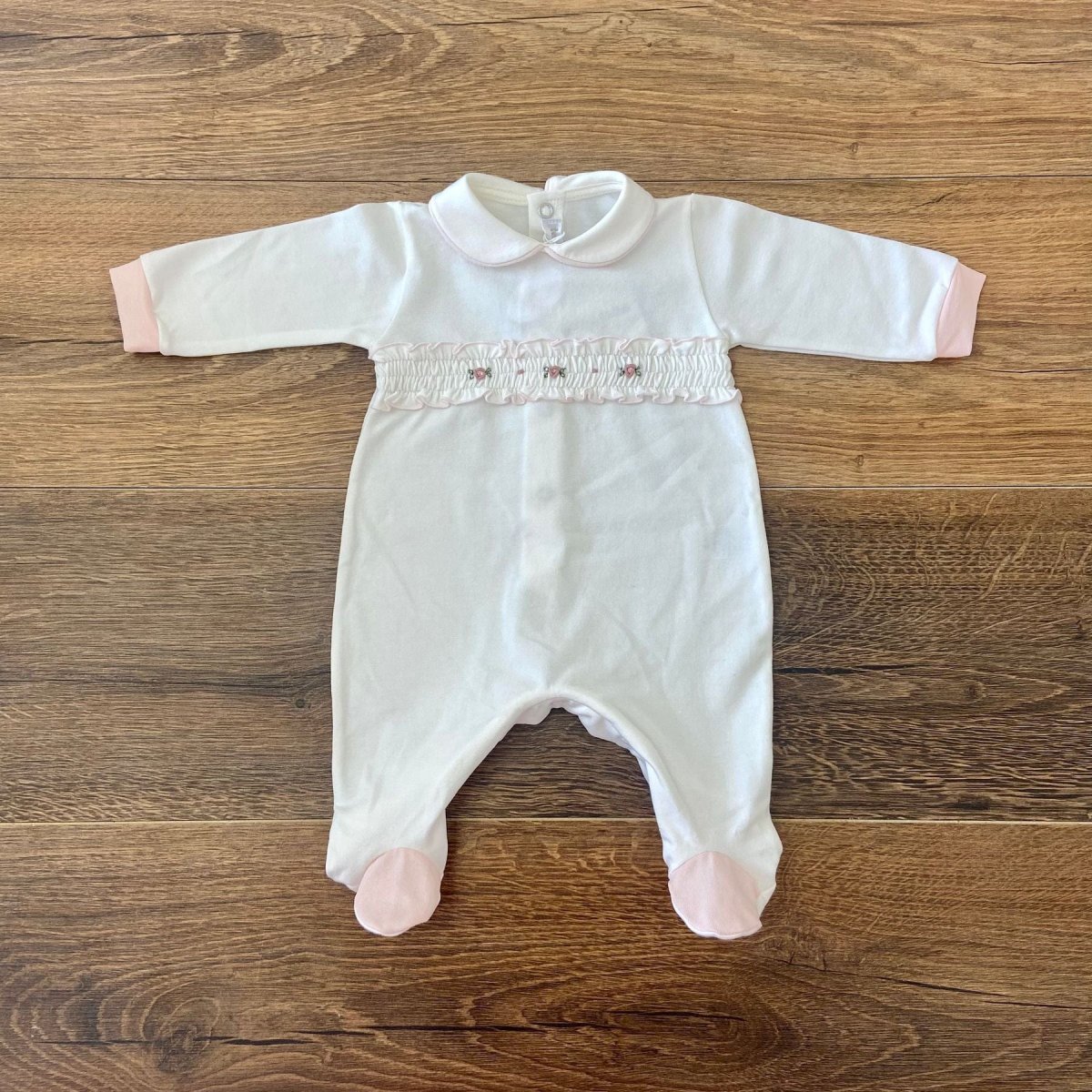 Tutina con arriccio e roselline ricamate a mano.