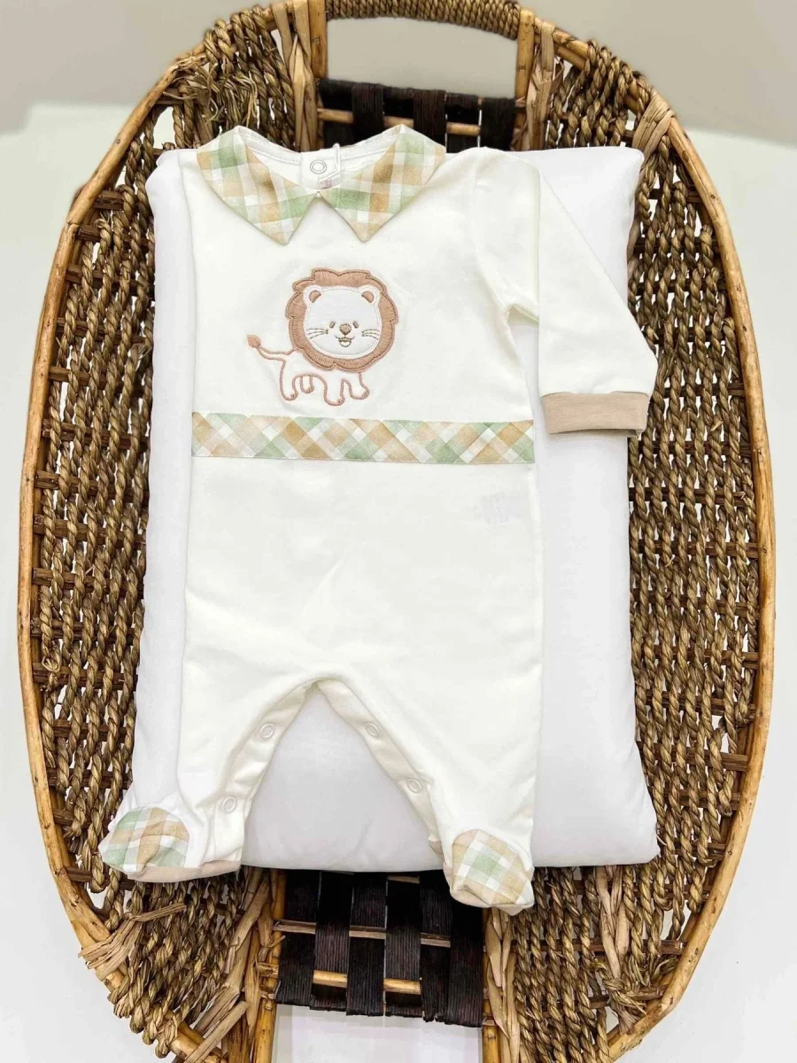 Tutina intera neonato in cotone con ghettine con fascia Vichy in vita e stampa con leoncino, colletto con fantasia Vichy.