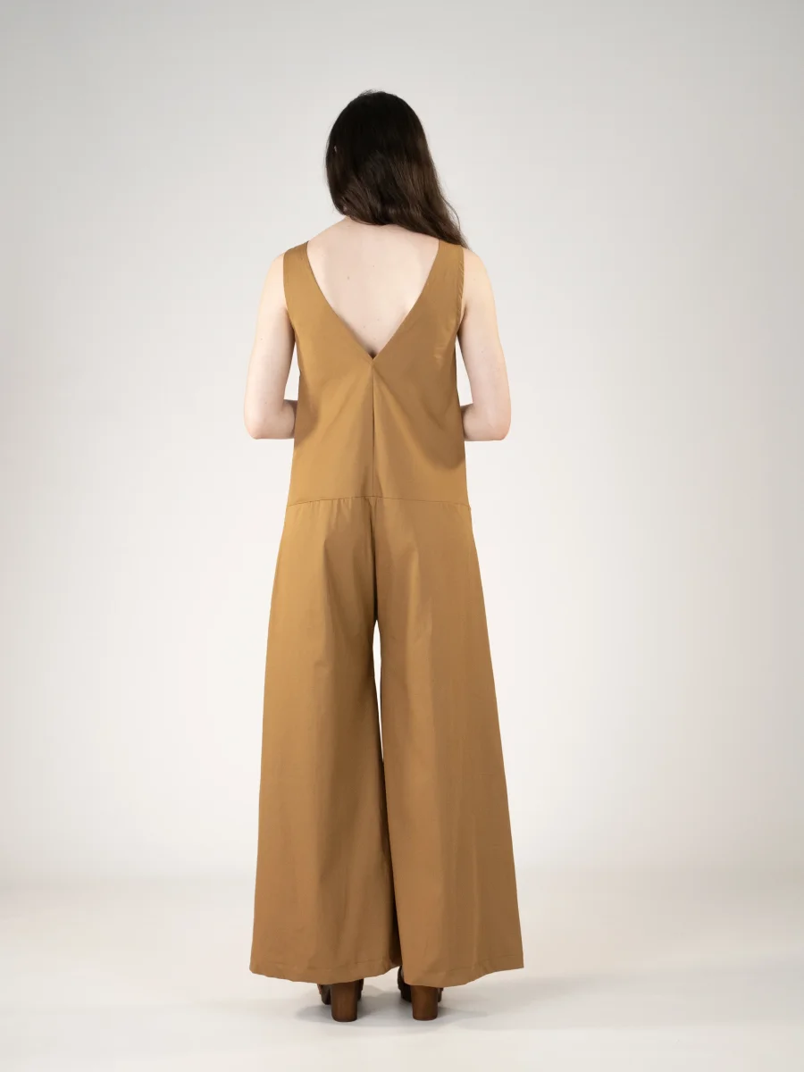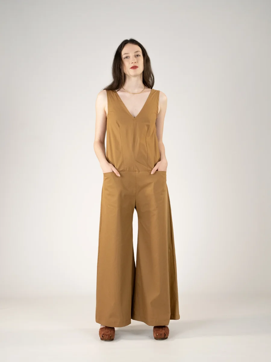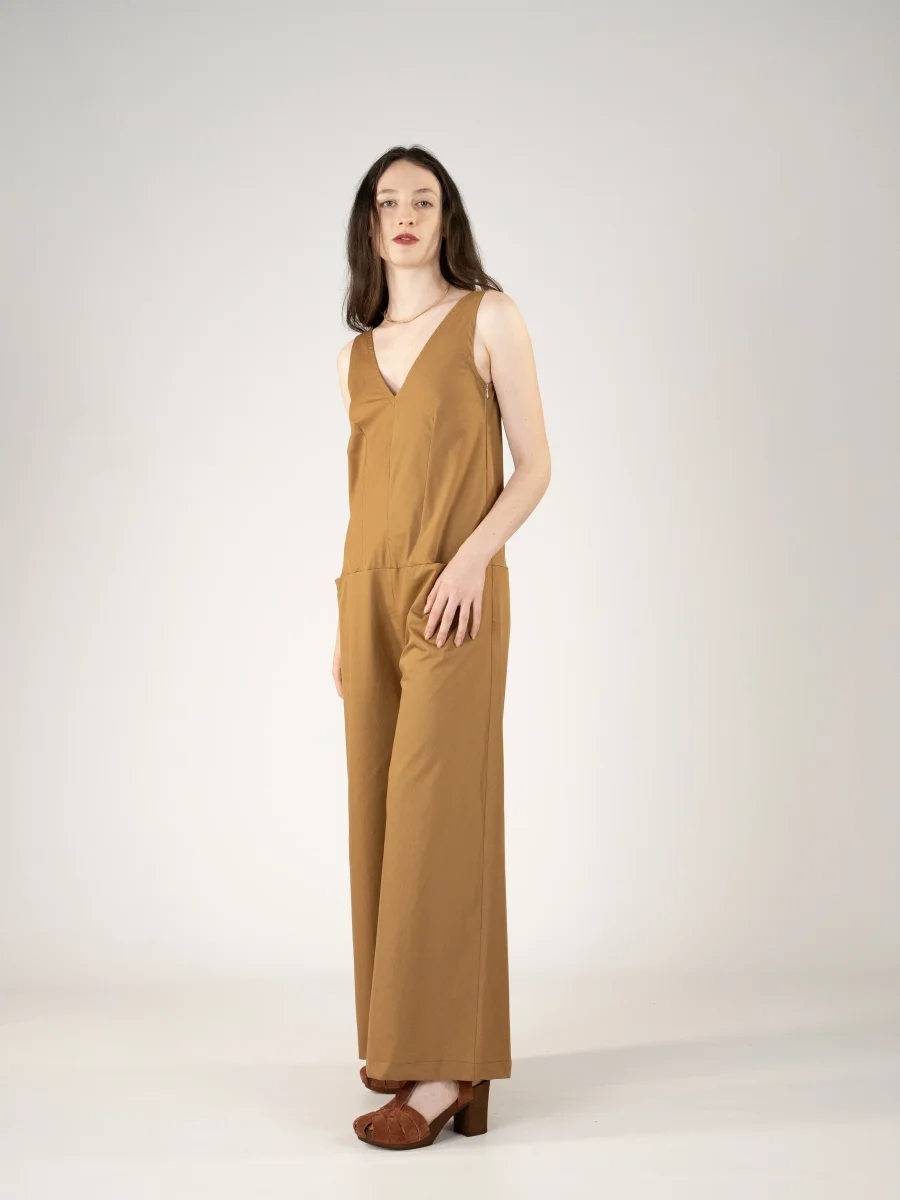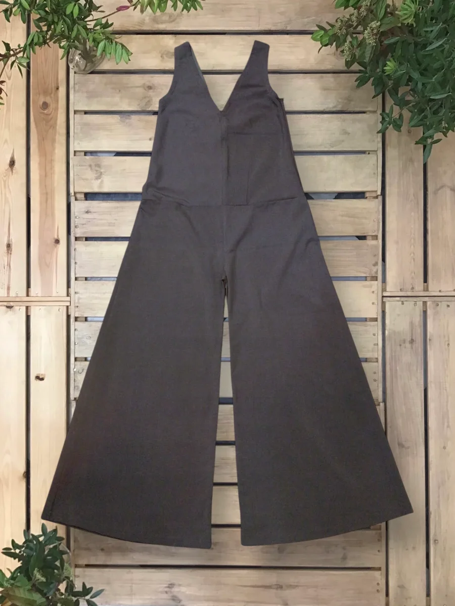 Tuta con scollo a V davanti e dietro, gamba svasata e taschine frontali.