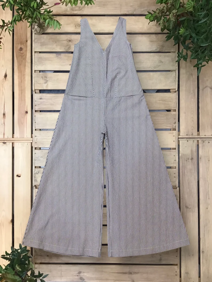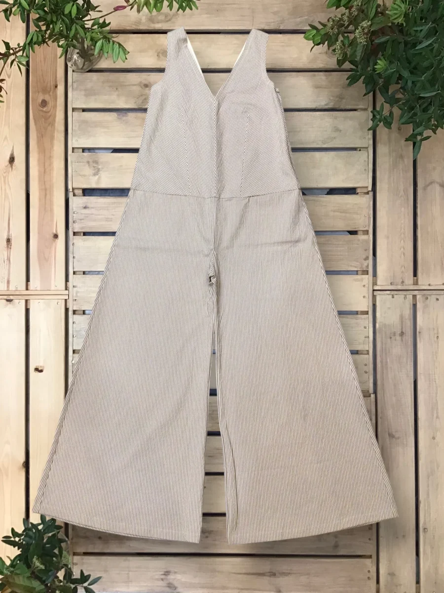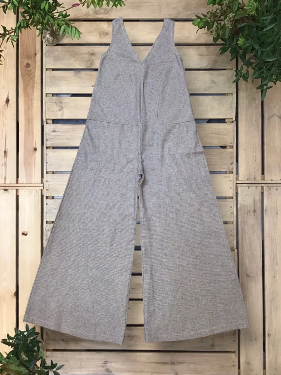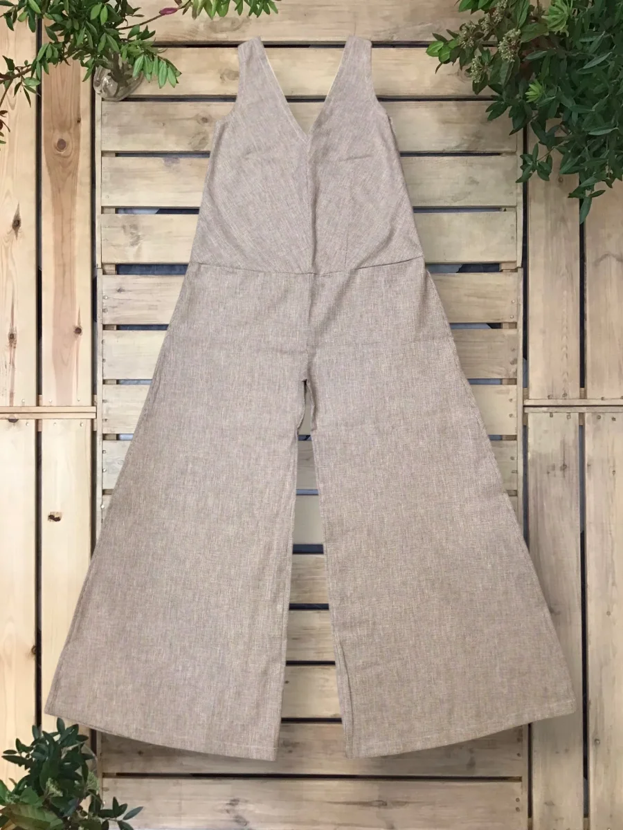 Tuta con scollo a V davanti e dietro, gamba svasata e taschine frontali.