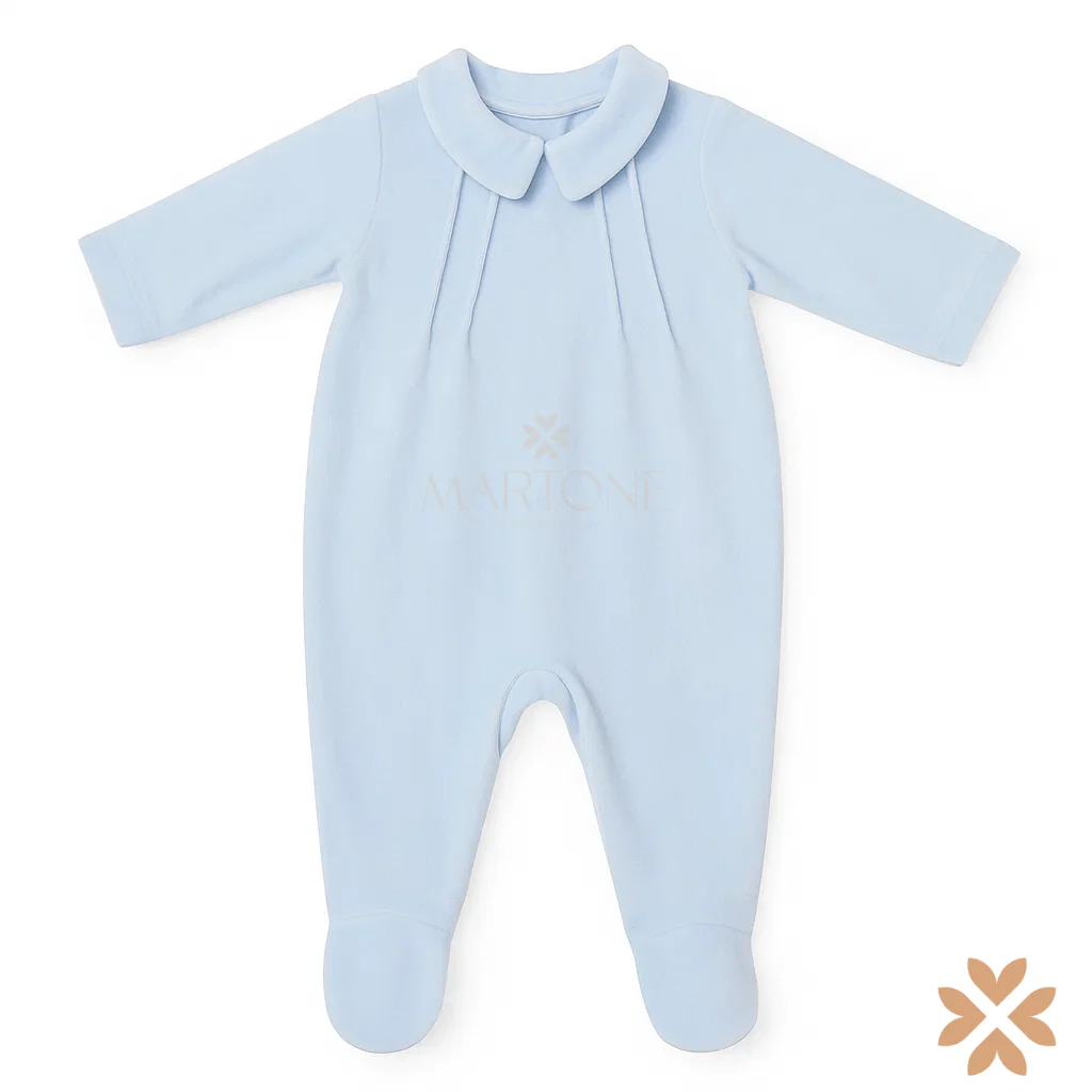 Tutina in ciniglia per neonato con colletto, apertura sul retro e sul cavallo per agevolare il cambio. Morbida e confortevole, ideale per accompagnare il bebè nei primi mesi con stile e praticità.