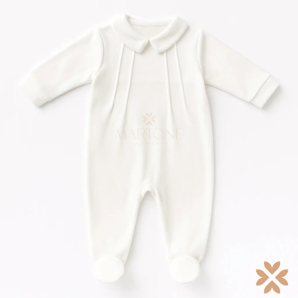 Tutina in ciniglia per neonato con colletto, apertura sul retro e sul cavallo per agevolare il cambio. Morbida e confortevole, ideale per accompagnare il bebè nei primi mesi con stile e praticità.