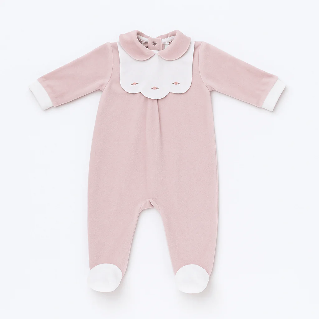 Tutina intera in ciniglia per neonata, con finta bavetta decorata da roselline ricamate. Morbida e delicata, ideale per un look dolce e raffinato.
