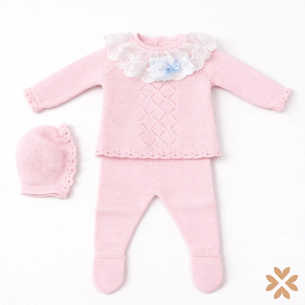Completo due pezzi in filo di cotone con maglia arricchita da colletto ricamato e lavorazione centrale decorativa. Ghettina con piedini coordinata. Cuffietta abbinata. Chiusura sul retro con bottoni.