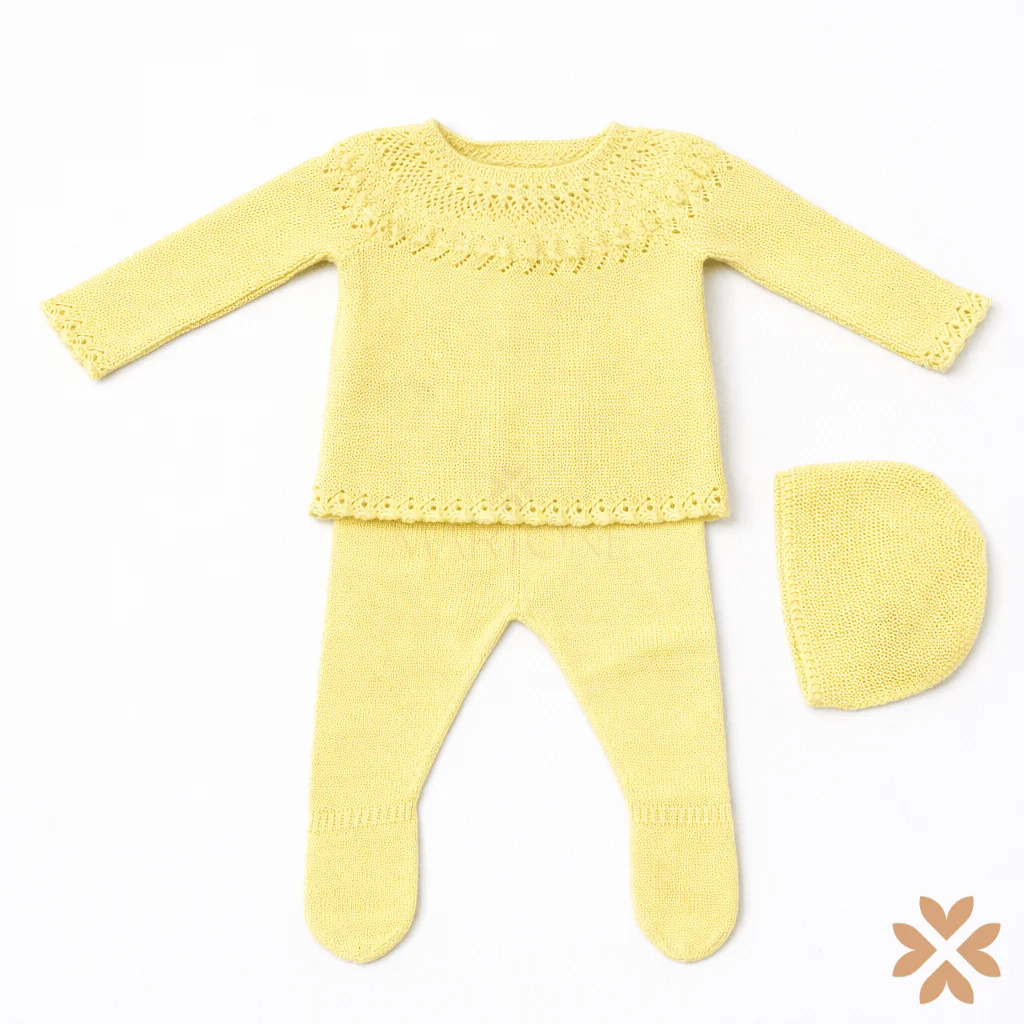 Tutina spezzata per neonato in filo di cotone, maglia con lavorazione traforata ed abbottonatura sul retro, cuffia coordinata e ghettine.