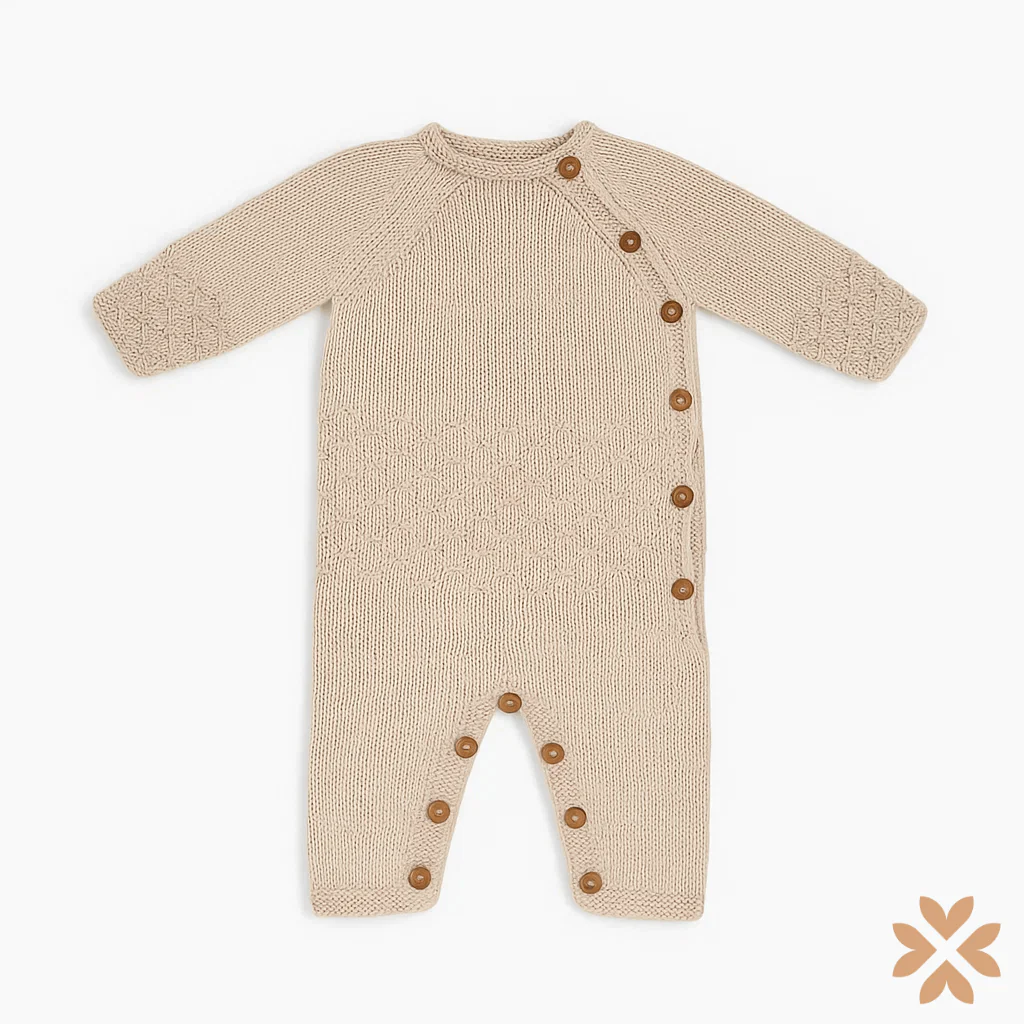 Tutina in maglia dal fascino essenziale, valorizzata da una lavorazione a intreccio che si estende sulle maniche e sulla parte inferiore del modello. La chiusura laterale con bottoni in legno accompagna l’intera lunghezza, facilitando la vestibilità senza rinunciare all’eleganza. La tonalità crema ne sottolinea la delicatezza, rendendola perfetta per completare con stile il corredino della neonata.