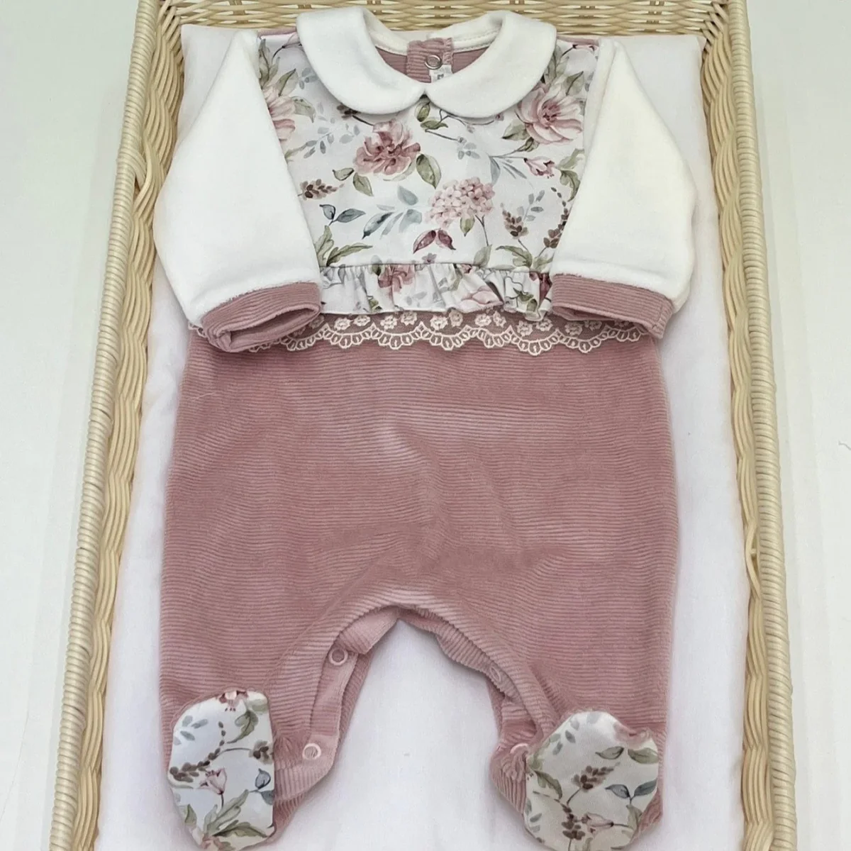 Una dolcissima tutina per neonata in ciniglia rigata, con una delicata stampa floreale sul petto che aggiunge un tocco di freschezza. La vita è adornata da eleganti rouches in pizzo, che conferiscono un’aria romantica e raffinata, rendendo il capo sia comodo che stiloso per la tua piccola.