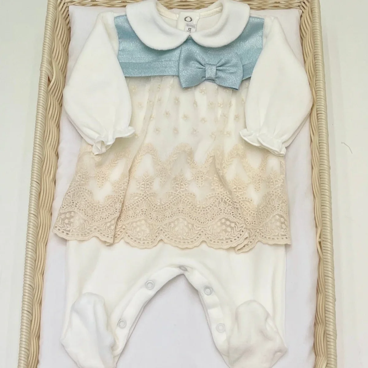 Una graziosa tutina in ciniglia, caratterizzata da una delicata balza sovrapposta in tulle e pizzo che crea un effetto vaporoso e romantico. Sul petto, una fascia in lurex verde acqua aggiunge un tocco luminoso, impreziosita da un piccolo fiocco centrale che completa l’insieme con eleganza. Perfetta per donare un look speciale e raffinato al tuo neonato.