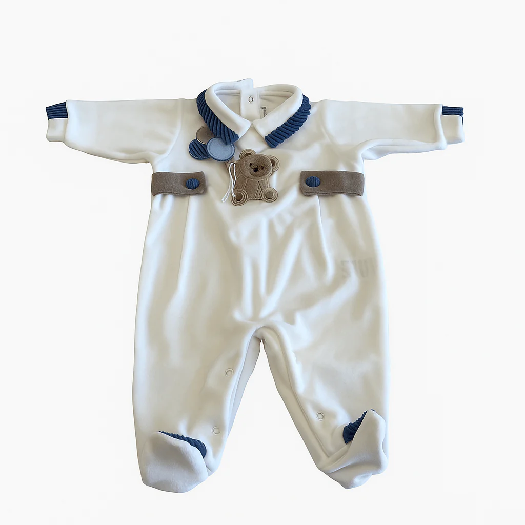 Tutina intera per neonato in ciniglia con dettagli a contrasto e orsetto applicato sul davanti. Chiusura con bottoni a pressione sul retro e sul cavallo.