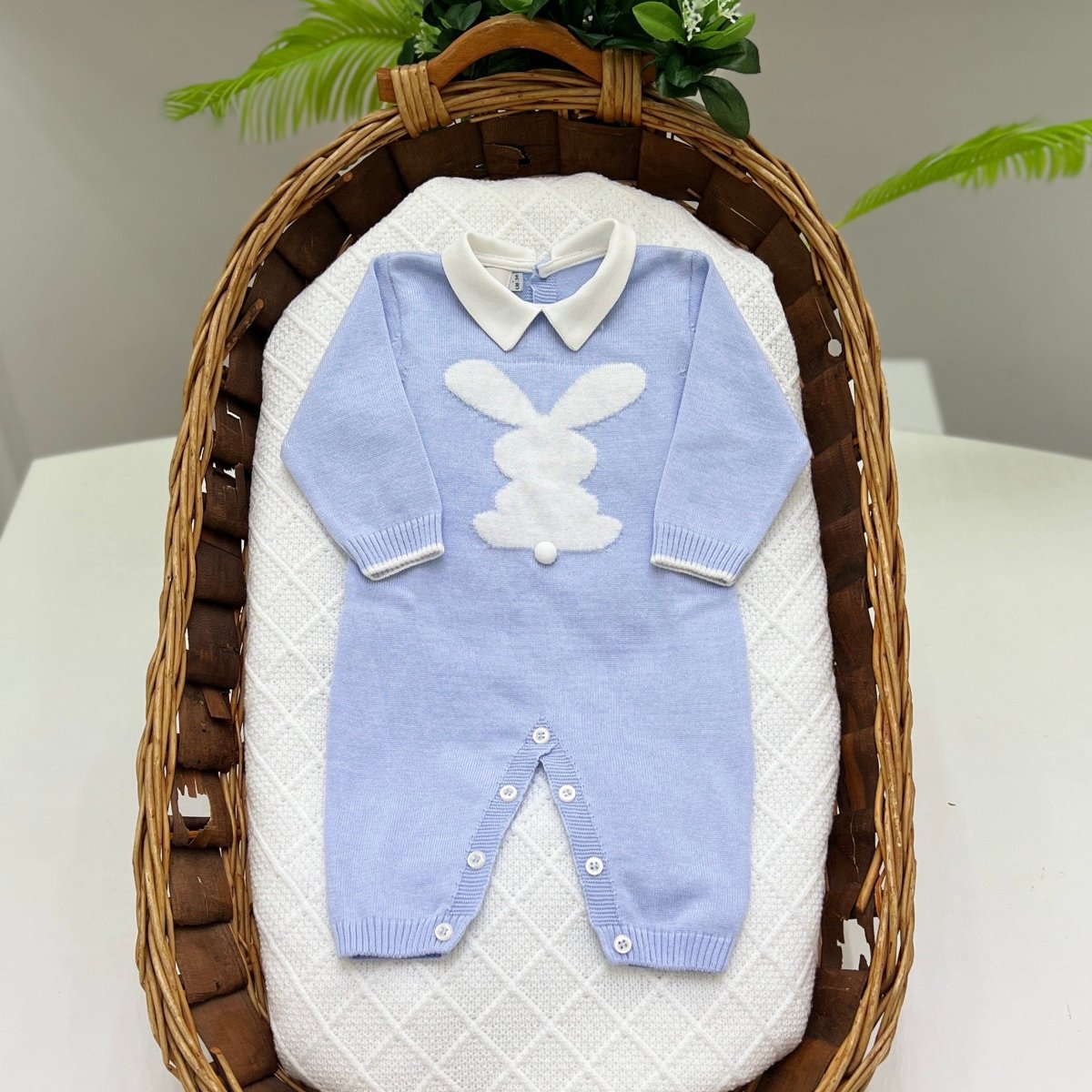 Tutina intera in filo di cotone celeste, con colletto in piquet e coniglietto raffigurato sul davanti. Un capo raffinato e confortevole, ideale per i primi giorni del neonato.