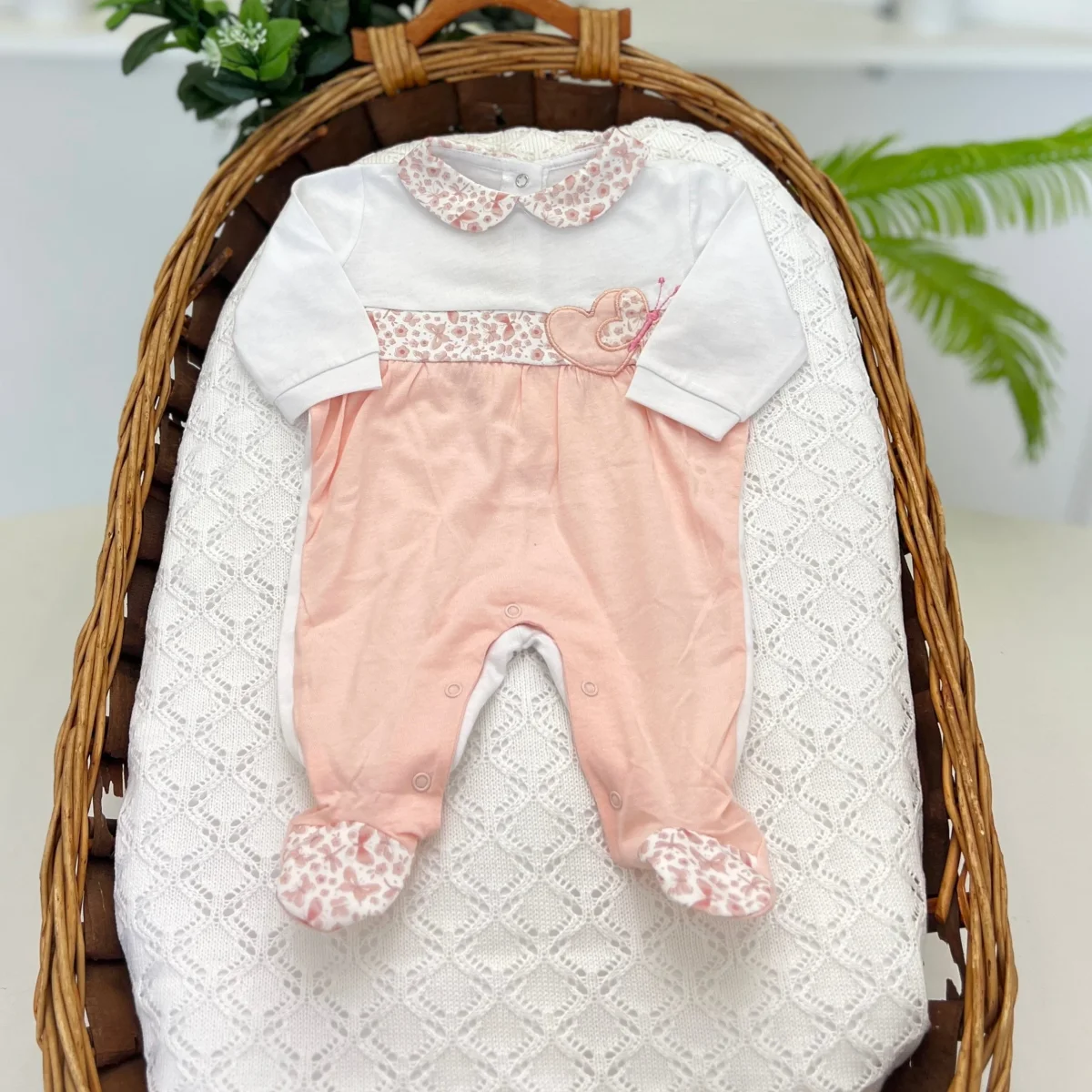 Una tutina intera in cotone per neonata, pratica e confortevole. Il design con ghettine integrate avvolge delicatamente il bebè, mentre la maglia svasata con fascia floreale aggiunge un tocco di dolcezza. Perfetta per un look quotidiano elegante e funzionale.
