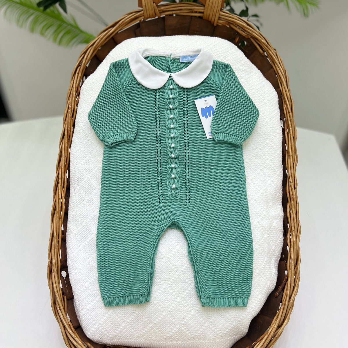 Tutina intera in filo di cotone con delicati trafori e colletto in piqué di cotone. Morbida ed elegante, con bottoncini sul retro per una vestibilità pratica. Ideale per le occasioni speciali.