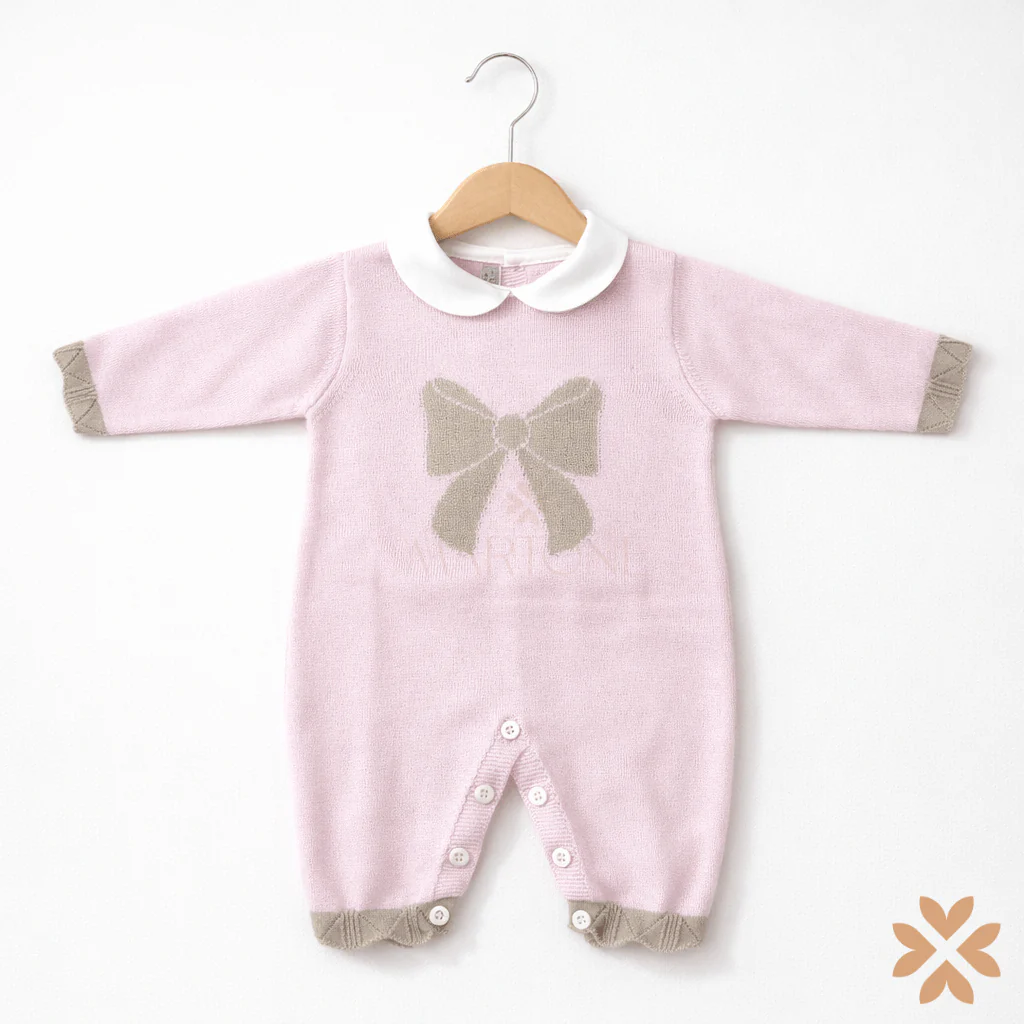 Tutina in filo con colletto e fiocco ricamato, chiusura con bottoni.