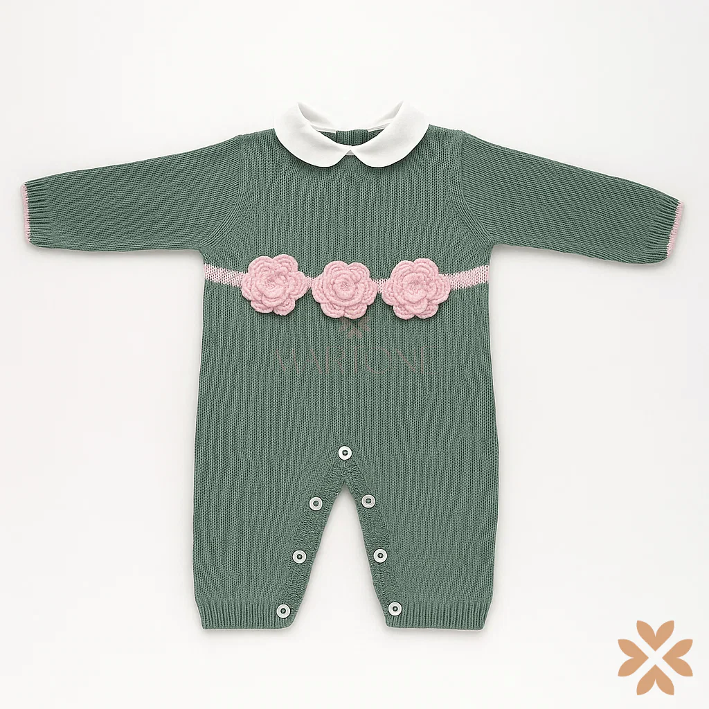 Tutina in maglia verde salvia con colletto bianco e decorazione a tre rose rosa in rilievo sul punto vita. Modello con bottoncini sul retro e sul cavallo per un pratico cambio. Un capo raffinato e confortevole, ideale per i primi mesi.