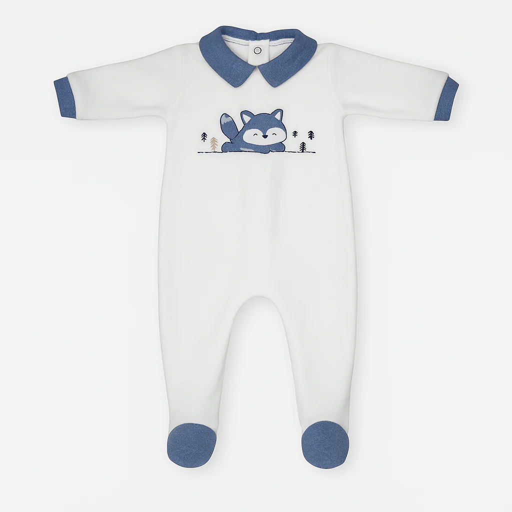 Tutina intera in ciniglia, soffice e confortevole, con dolce volpino ricamato sul davanti.