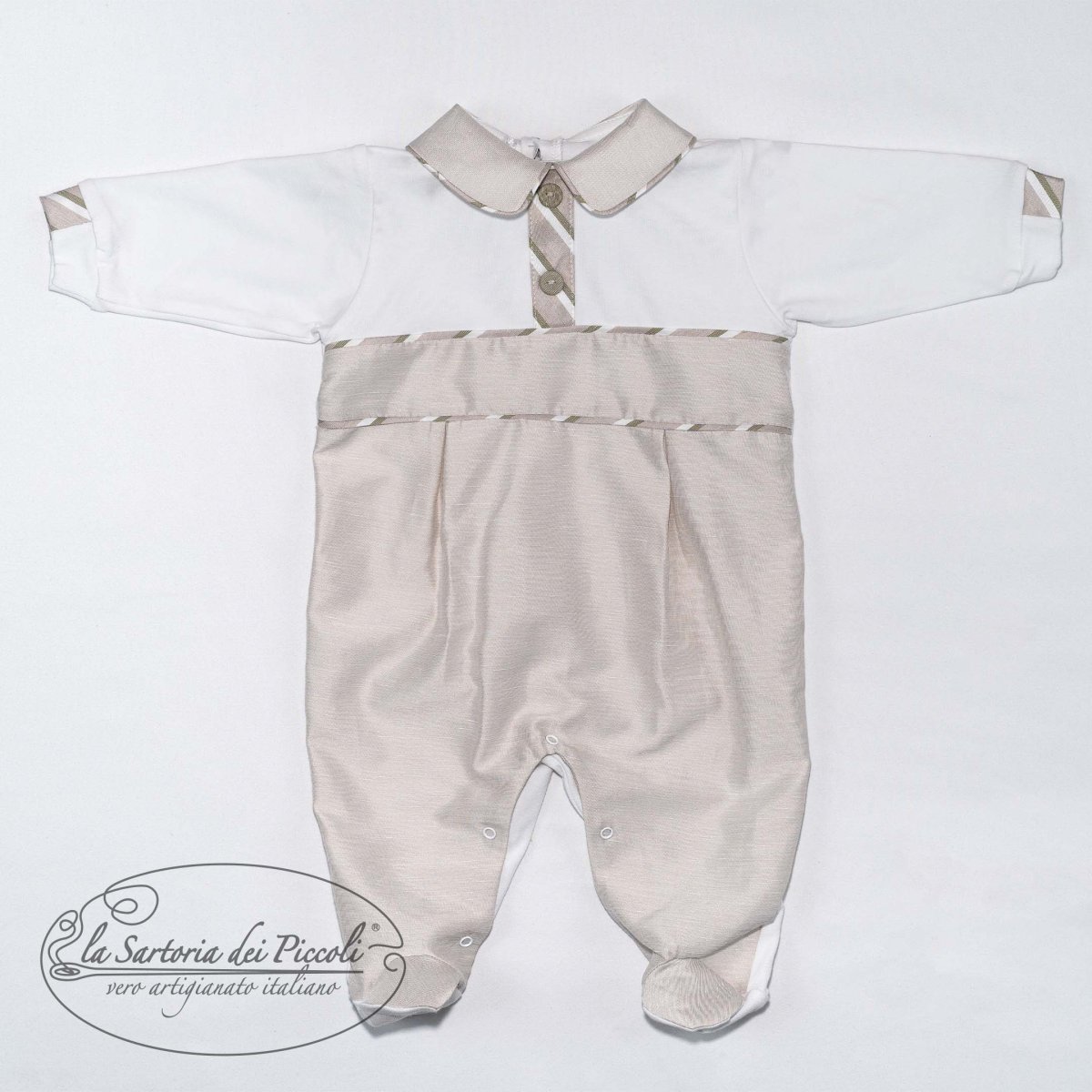 Tutina in cotone per neonato con colletto a contrasto e dettagli a righe verdi. Un design semplice e elegante, ideale per un look comodo e curato.