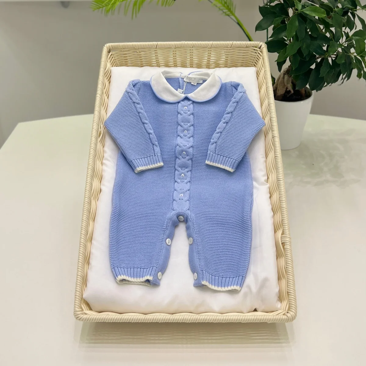 Tutina in pura lana lavorata a maglia, colletto in piqué e bottoncini sul retro e sul cavallo.