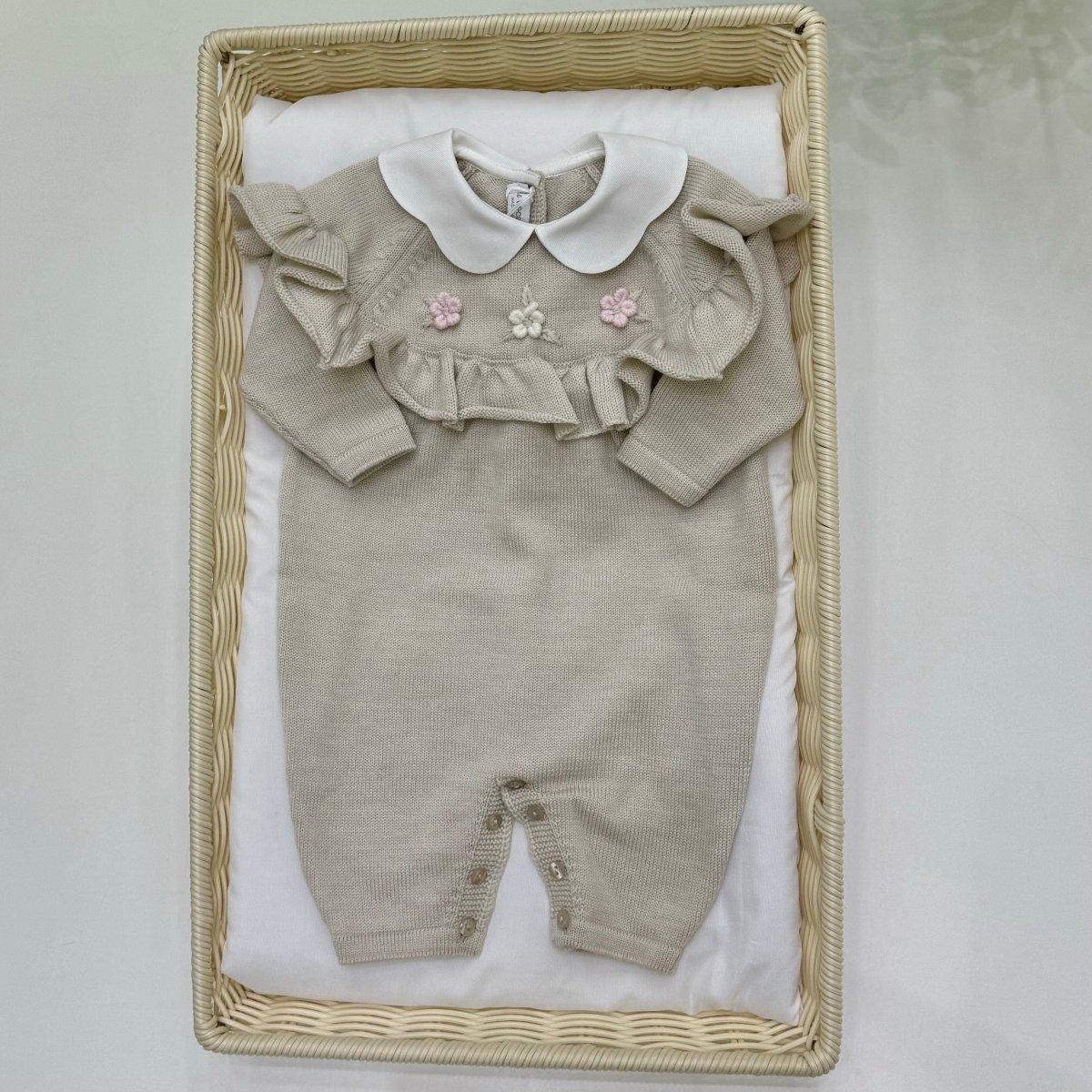 Tutina intera in pura lana vergine, con rouches e fiori ricamati a mano, colletto smerlato in piqué di cotone.