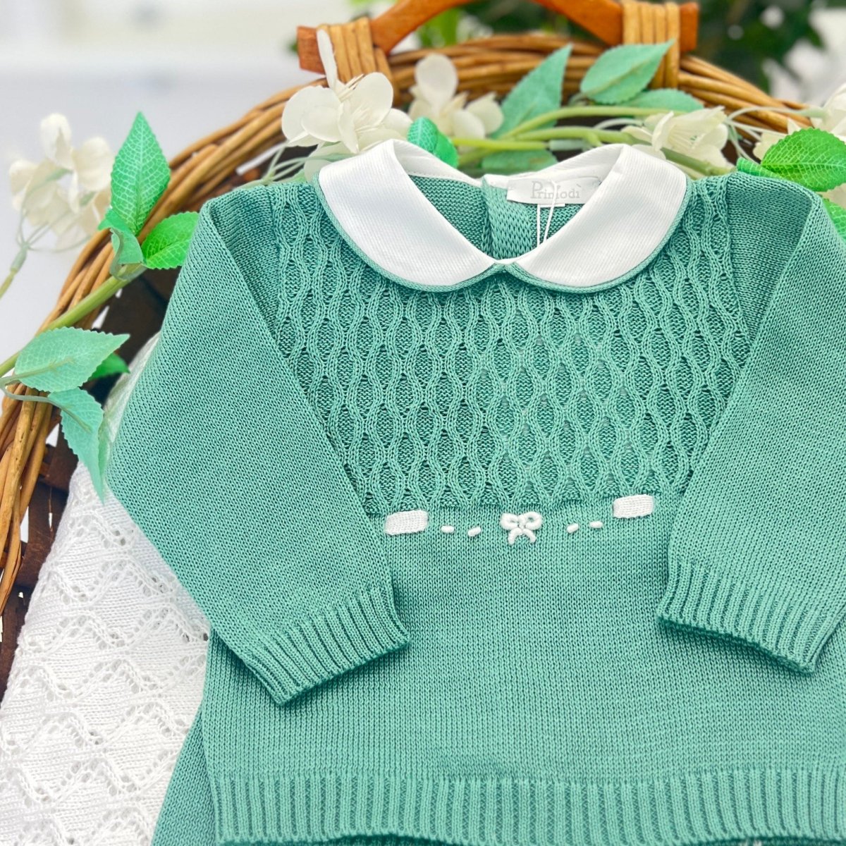 Tutina spezzata in filo di cotone per neonato, con delicati dettagli in punto smock e ricami nodo d’amore. Colletto bianco a contrasto per un tocco di eleganza senza tempo.